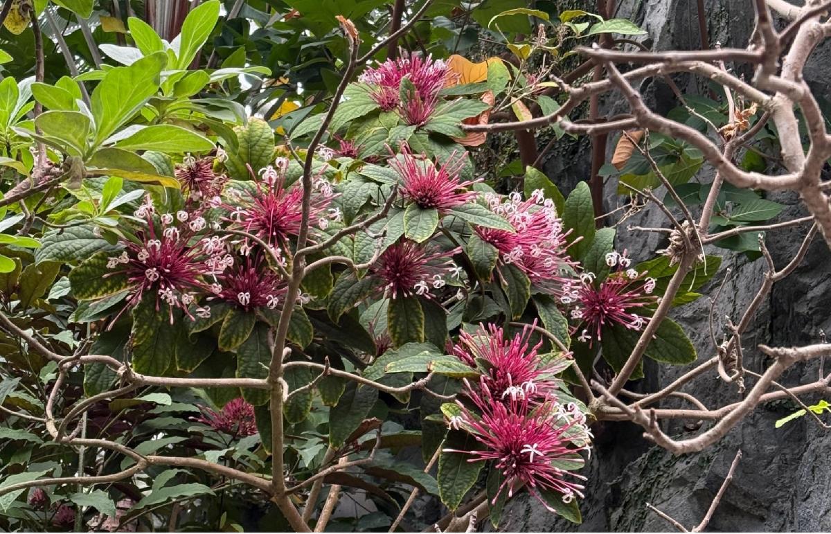 《煙火樹》屬常綠灌木,花期長達三個月,原產新幾內亞至菲律賓。葉面綠色,葉背紫紅色。聚繖花序頂生,筒狀花基部紫紅色,白色花冠5裂,有香味。果實紫黑色。開花冬至春季。葉色特殊,花序大而醒目,有很好的聚焦效果,本種花序直徑可達20公分以上,開花如煙火般壯大華麗,世界各地植物園溫室常栽培作為主題特色樹種。