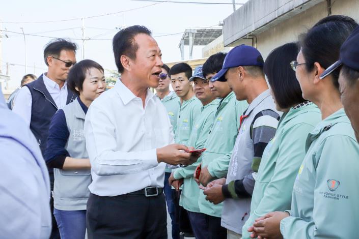 嘉義縣長翁章梁慰勞第一線清潔隊員的辛勤付出,今14日與水上鄉長林緗亭、嘉義縣環保局長張輝川等人前往水上清潔隊提前向隊員拜年並發放馬年小紅包,感謝大家全年無休維持環境整潔。