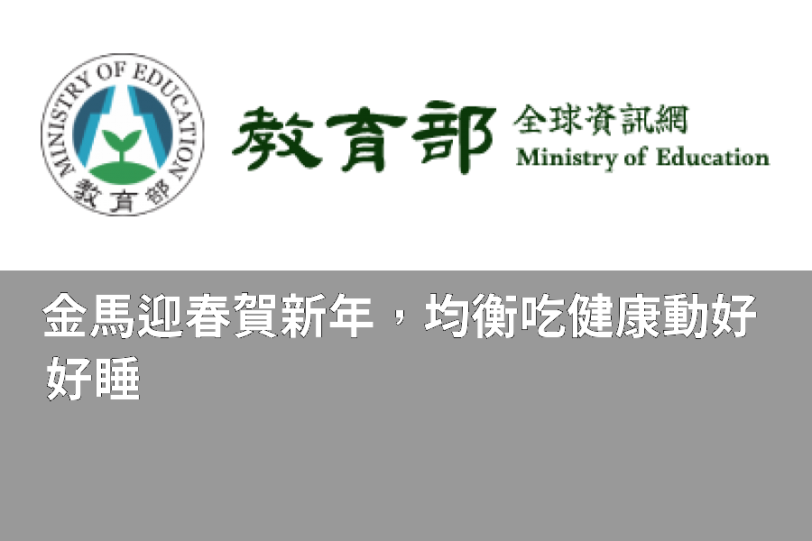 教育部鼓勵學生在春節假期勵行「均衡吃、健康動、好好睡」三原則,享受節慶歡樂氛圍中養成健康生活型態,學會重視生活作息與健康管理,度過一個開心又充實的金馬年,也為新的一年蓄積滿滿的能量,開學後更能迅速進入學習狀態,發展更好的自我。祝福全體同學:學習馬力全開、身體健康精神好!