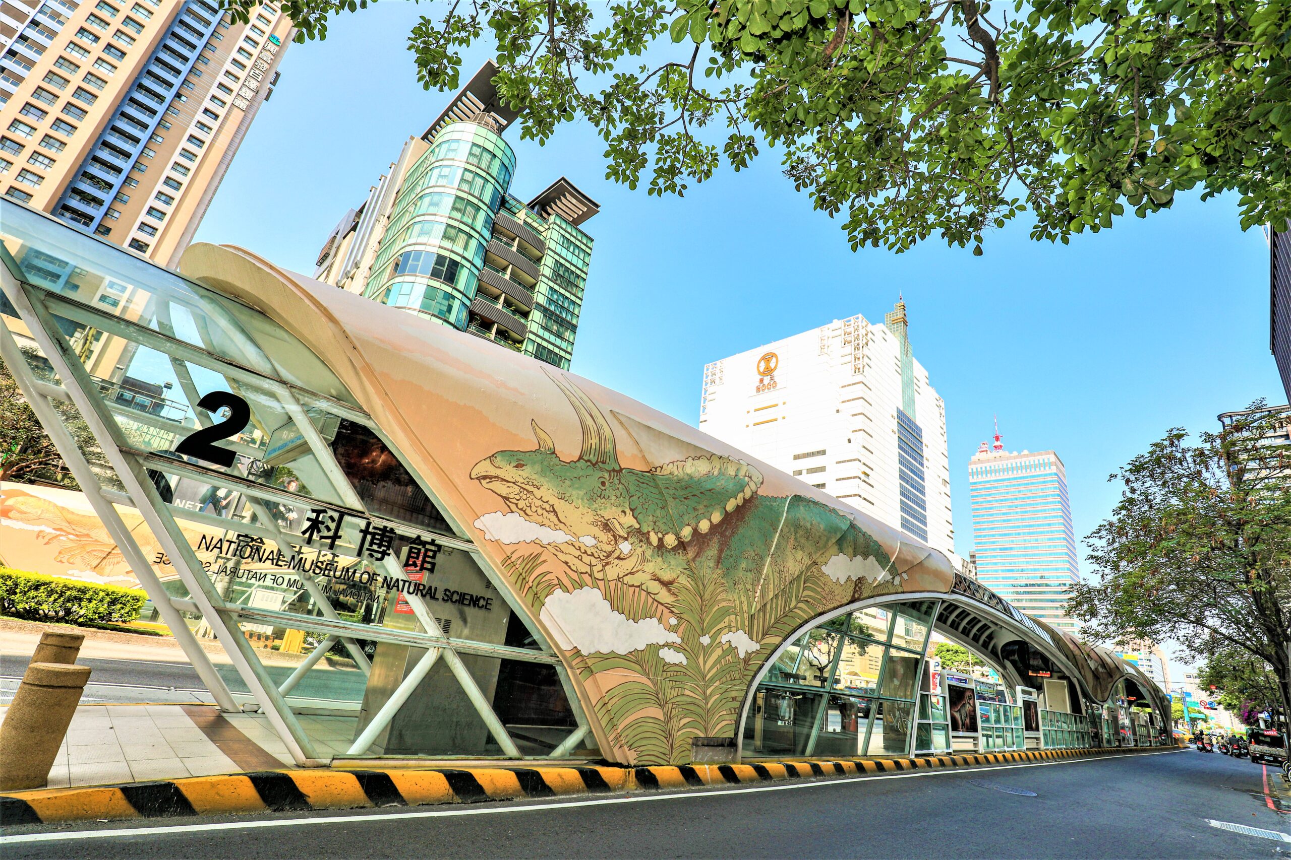 國立自然科學博物館館長黃文山表示,將認養行動轉化為創意展演,台灣大道兩座專用道站體延伸為「路面上的博物館」,站體外觀彩繪暴龍、三角龍、竊蛋龍與伶盜龍等六隻人氣恐龍,站內打造夢幻星空與植物園意象,為提升公共運輸環境多元性,站體空間配合展覽定期更新,《鯨掘》特展期間,化石清修師的幽默插畫融入候車視覺,近期則換上繽紛《必可飛劇場》,使候車片刻成為一場與自然科學對話的奇幻旅程。
