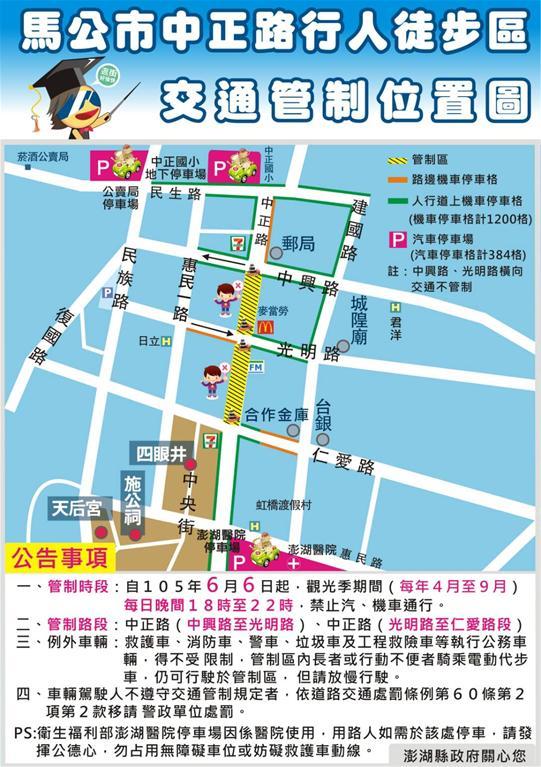 端午節連續假期期間請民眾注意: 一、端午節 4天 連假預估返鄉、外出旅遊至景點車輛增多,將會停車壅塞。請遊客注意停車秩序,請勿隨意停車造成交通擁亂,另提醒遊客中正路商圈自105年6月6日至9月底止,實施行人徒步區,如下宣導資訊,請注意配合交通管制。 二、請隨時注意澎湖縣政府連續假期交通疏運網站專區(http://goo.gl/y2tMKX),及縣政府鄉親機位需求窗口網站(event.penghu.gov.tw/booking)查詢班機登記訊息,有關航空及海運班次交通資訊,預作返回交通規劃事宜。 三、端午節連假期間各地均容易有降雨出現,並容易出現局部較明顯的雨勢,尤其鋒面系統常伴隨瞬間大雨、雷擊及強陣風等劇烈天氣現象,澎管處提醒鄉親及遊客雨中行車應特別注意行車安全。 澎湖國家風景區管理處關心您!