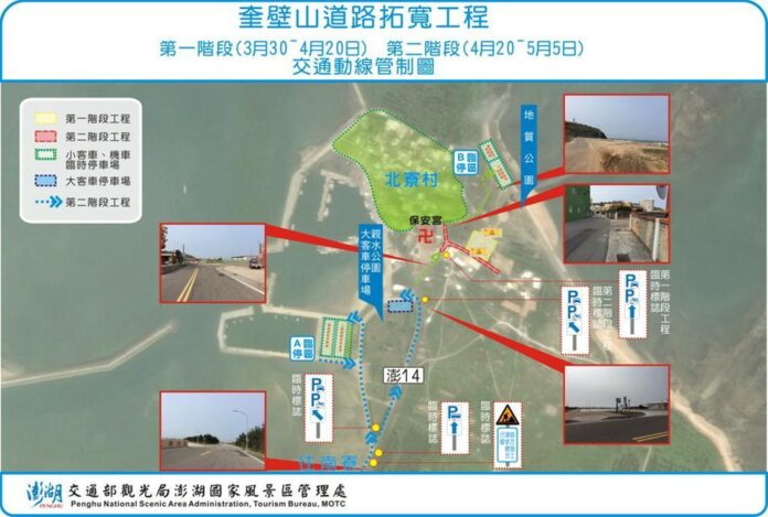 澎湖國家風景區管理處考量奎壁山地質公園前道路僅為單線道,民眾使用不便,於今(105)年度辦理道路拓寬工程,並將進行小客車停車場空間調整及廣場舖面改善,施工期間自105年3月30日起至105年5月5日止,將封閉部份道路及交通管制。