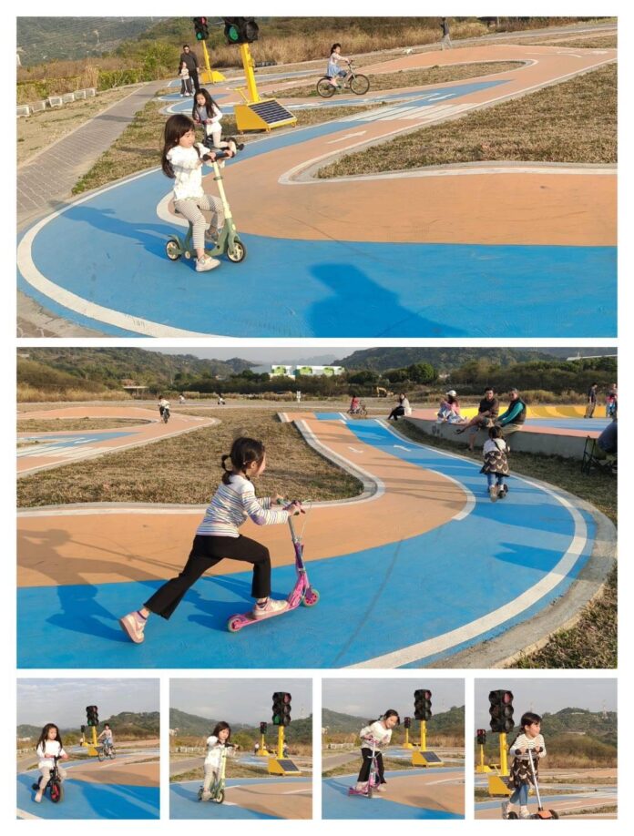 位於大里塗城地區的「草湖溪滑步車道暨滑板車廣場」於114年12月完工,並於今(115)年1月正式開放,規劃約2,500平方公尺活動空間,鋪面採繽紛活潑設計,融入紅綠燈、道路標誌等交通號誌元素,讓孩童在遊戲過程中自然建立交通安全觀念,在奔跑與騎乘之間學習守規矩,家長也能安心陪伴,共同享受親子互動時光,打造結合運動、學習與休閒功能的河濱新據點。