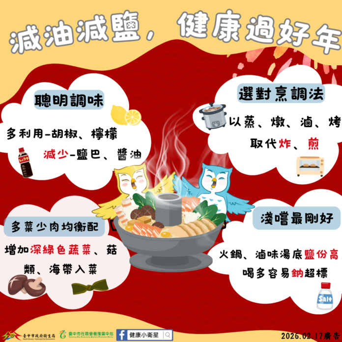 衛生局營養師提醒,年節料理多偏油、偏鹹、偏甜,容易增加身體負擔,尤其對於有高血壓、糖尿病或高血脂等慢性病的民眾,更需留意飲食內容。 建議以清蒸、燉煮、川燙及少油快炒等清淡烹調方式為優先,避免攝取過多油脂。火鍋類料理亦須留意鈉含量,建議 「淺嚐湯頭」即可,避免喝下煮過多樣食材的高鈉湯底 。
