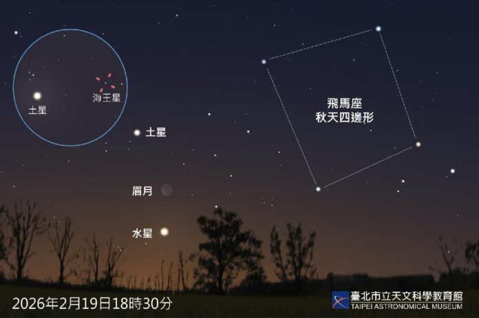 19日除了水星是亮點外,日落餘暉中還可在西方低空看到亮達-3.9等的金星。稍晚金星落入地平線下天色轉暗後,正適合觀賞馬年應景的飛馬座「秋天四邊形」,此時水星、土星與細細的眉月共同構成一幅無論肉眼觀賞或攝影都不可多得的天際美景,若用雙筒望遠鏡或小望遠鏡仔細觀察,或許還能在離土星不到1度處找到水藍色的海王星!更多相關天象資訊,請參閱臺北天文館網站「天象預報」。