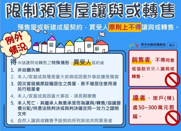 地政局說明,為保障消費者權益,本市提供便捷的申請書線上產製系統,加快填寫申請書時間,歡迎民眾至本局官網(https://www.land.taichung.gov.tw/)/不動產專區/E契搞定 易起幸福/預售屋或新建成屋買賣契約讓與或轉售申請書線上產製系統多加利用。同時提醒在112年7月1日以後簽約者,原則上不得讓與或轉售,違反規定將按戶(棟)處以新台幣50萬至300萬元罰鍰,如有轉讓、轉售需求,一定要依照相關規定辦理,切勿心存僥倖,以免違規受罰