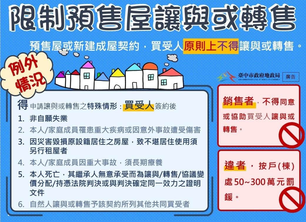 自112年7月1日起,《平均地權條例》新制正式上路,為遏止預售屋炒作,原則上預售屋之買受人不得將契約讓與或轉售予第三人,亦不得自行或委託刊登讓與或轉售廣告;僅於符合法定例外情形,並經主管機關審查同意後,始得辦理讓與或轉售。臺中市政府地政局為便利民眾申辦、提升行政效率,全國首創「預售屋或新建成屋買賣契約讓與或轉售申請書線上產製系統」,獲得市民高度肯定,使用人次已逾千人次,大幅節省申辦時間,以智慧化地政服務,提供市民更高品質的服務體驗,展現數位便民服務的具體成果。