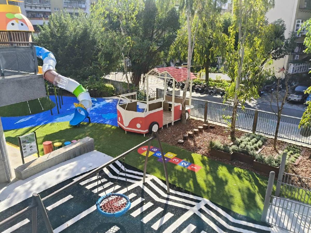 整體遊戲場以孩子的成長與學習歷程為核心,從夢想出發、向世界前進,規劃三大主題區、六項以上遊具設施,名稱皆由全校師生共同票選產生,充分展現參與式學習精神。透過設置「夢想起飛」彈跳床與「夢想鞦韆」,象徵孩子懷抱夢想、勇敢啟程,培養自信心與想像力;進一步結合食農教育的「幸福田園」、深受孩子喜愛的角色扮演設施「美味胖卡車」,以及培養節奏感與感官統整能力的「節奏塔台」,引導孩子透過五感體驗深化生活素養與學習內涵;最後藉由攀繩、攀岩與多樣化溜滑梯所構成的探索設施,引導孩子勇於挑戰自我、突破限制,象徵走向國際、探索未來,打造一處兼具學習意義與高度吸引力、深受孩子喜愛的成長場域。