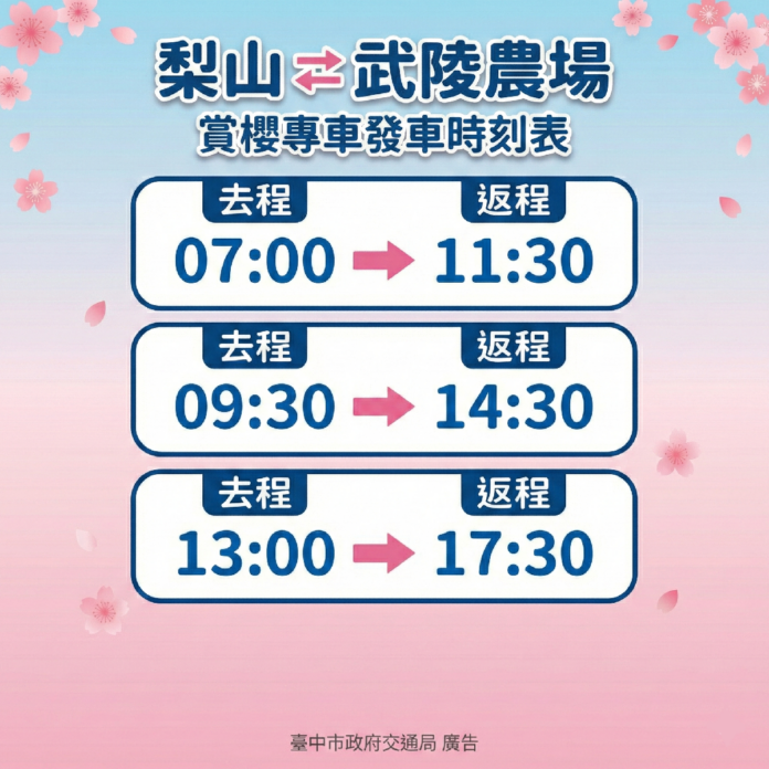 交通局長葉昭甫指出,「梨山-武陵農場」賞櫻專車一天規劃3個班次,採原班次來回,從梨山發車的時間為上午7時、9時30分及下午1時;自武陵農場出發的班次為中午11時30分、下午2時30分及5時30分,另預售票最晚需於「搭車日前2天」完成預訂,請民眾留意日期與時間。若錯過預售票時間,仍可於每日下午4時至6時,前往梨山遊客中心購買隔日之剩餘票券,每人限購6張,現場售完為止 。