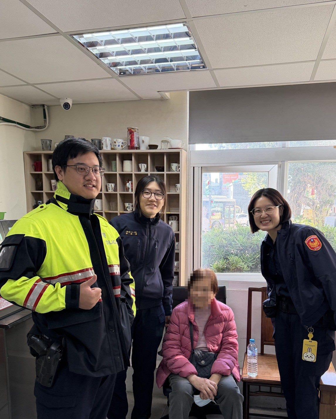 北投分局永明派出所警員余莉芃、潘成聿、警專實習生余相潔日前巡邏時,接獲民眾報案,表示有名婦人跌坐於北投區石牌路二段公車站,老婦無法說明身分資料,記不得回家方向,有輕微失智情況,車水馬龍、險象環生,員警便將老嫗載回派出所安置。