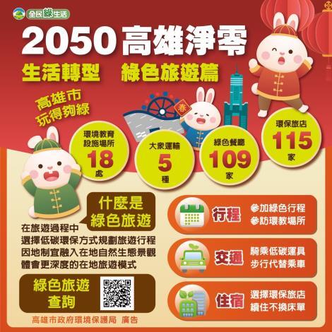 高雄市為打造綠色生活圈,積極推動轄內各類場所取得環保認證,截至111年12月取得18處環境教育設施場所、109處綠色餐廳、8間環保標章旅館及107間環保旅店,為讓民眾更深入體驗並輕鬆參與綠色旅遊,高雄市推出17條自由行行程,結合轄內環境教育設施場所或生態遊憩場所、綠色餐廳及環保旅館,供民眾選擇。食用在地食材、惜食點餐的綠色餐廳、住宿具環保標章的旅館或旅店自備個人盥洗用具續用床單毛巾、以低碳運具享受當地文化風光,結合生態的環境教育設施場所及選購具有環保標章、碳足跡標籤等環保產品,一同邁向綠生活,讓旅行也可以很環保,相關資訊可透過全民綠生活網查詢。