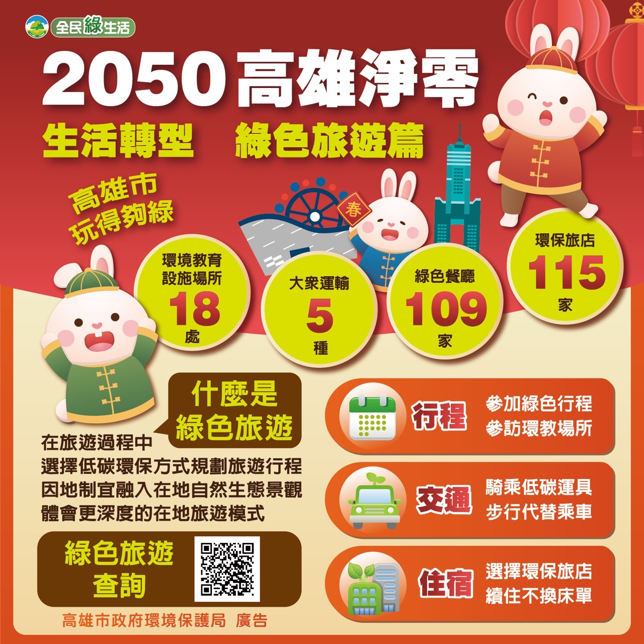 高雄市為邁向2050淨零碳排,為鼓勵民眾行為改變、落實綠生活作為,培養1.5度C生活模式,推動各項綠生活關鍵策略。搭上後疫情時代國內旅遊爆發熱潮,高雄市推廣民眾旅遊選擇環保標章認證綠色場域,在旅遊玩樂同時也能輕鬆減碳,落實淨零綠生活,今年春節假期出遊讓我們一起踏出「綠色旅遊」的第一步!