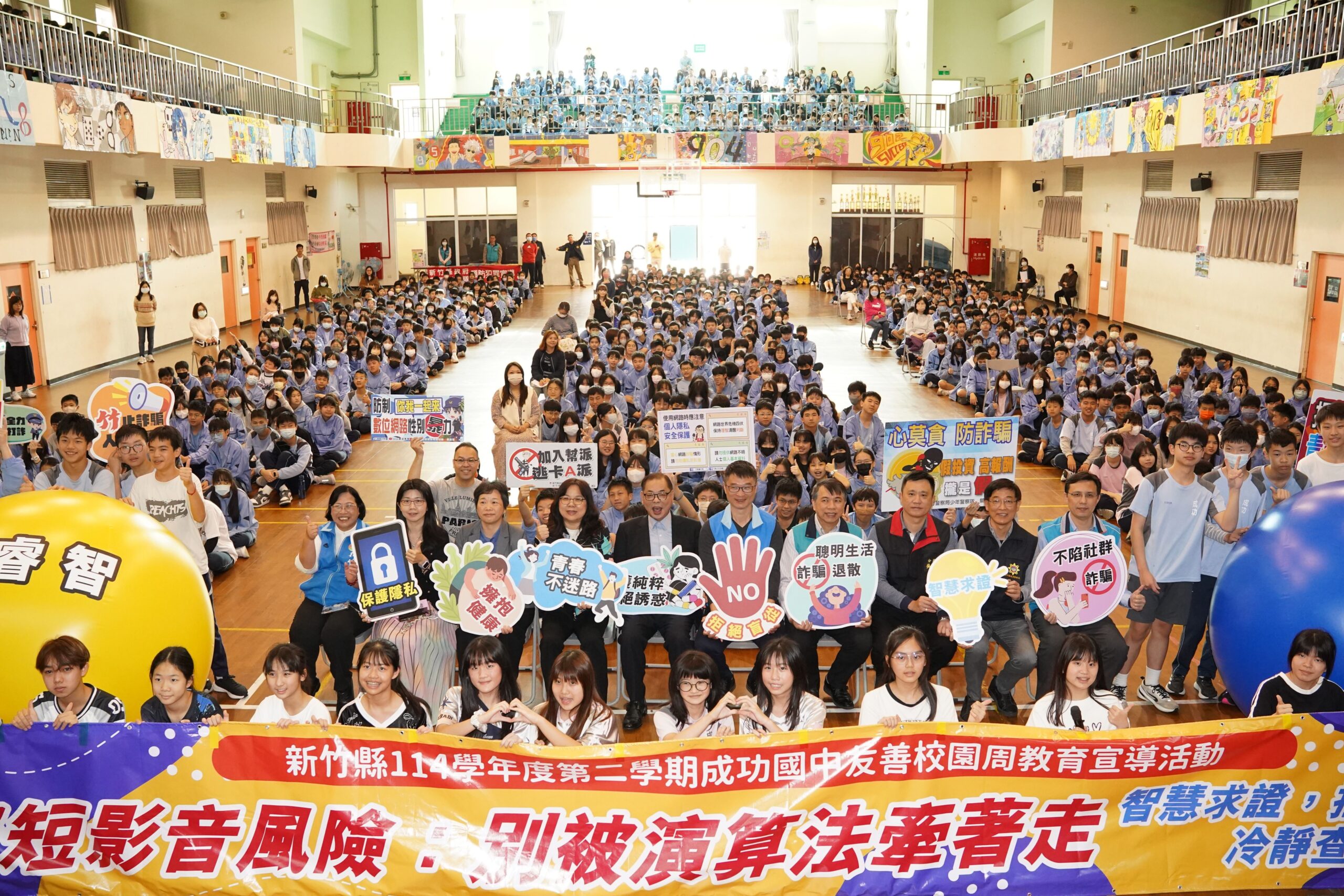 為打造安全、健康且具支持性的學習環境,新竹縣政府於114學年度第2學期持續推動友善校園週教育宣導活動,今(25)日上午於成功國中舉行宣導活動,由副縣長陳見賢主持,帶領全校師生共同宣誓推動友善校園理念,展現縣府與學校攜手守護學生數位安全與身心健康的決心。