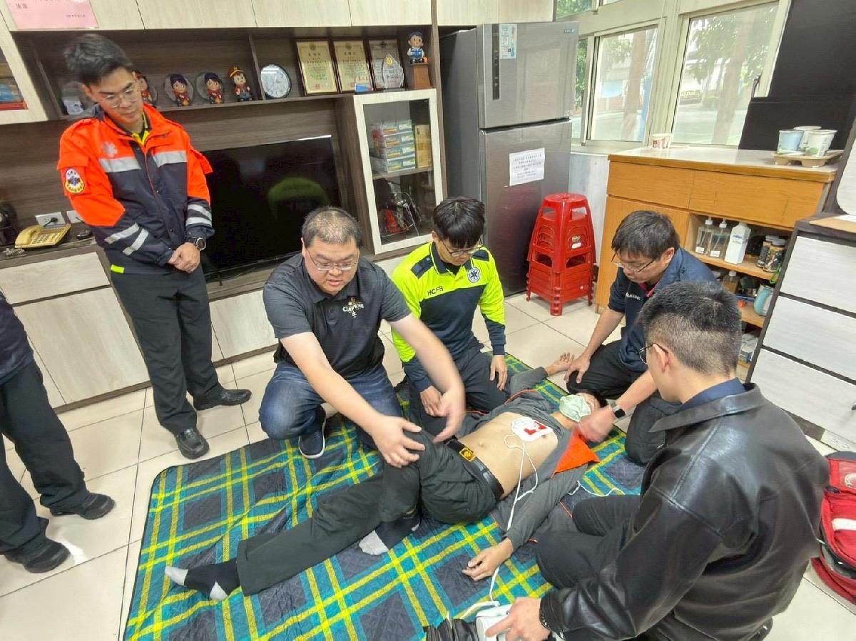 蘇子哲等人隨即接手急救流程,使用AED監測心律,持續高品質CPR,並同步給氧、建立呼吸道及施作骨針等處置。患者現場連續電擊5次後,立即送往湖口仁慈醫院急救。