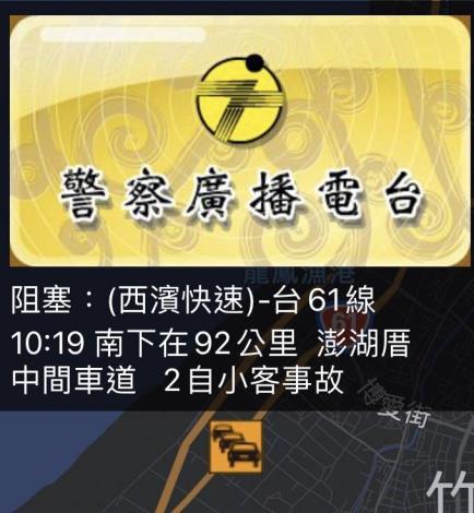 苗栗縣警察局竹南分局於112年1月23日10時許透過警政APP即時路況查詢及民眾報案,查西濱公路臺61線南下約92.33公里處(中美里路口),發生一起兩輛自小客車碰撞交通事故案,分局立即派遣員警趕赴現場處理。