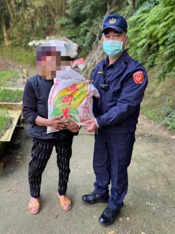 獅潭鄉善心人士委請大湖警分局百壽派出所贈送給轄區內獨居年長者及山區偏遠弱勢居民一袋米,百壽派出所所長黃木乾前(19)日親自送暖,讓居民在年期間都能夠吃到美味的米飯,在歲末寒冬中也能感受暖呼呼的愛。