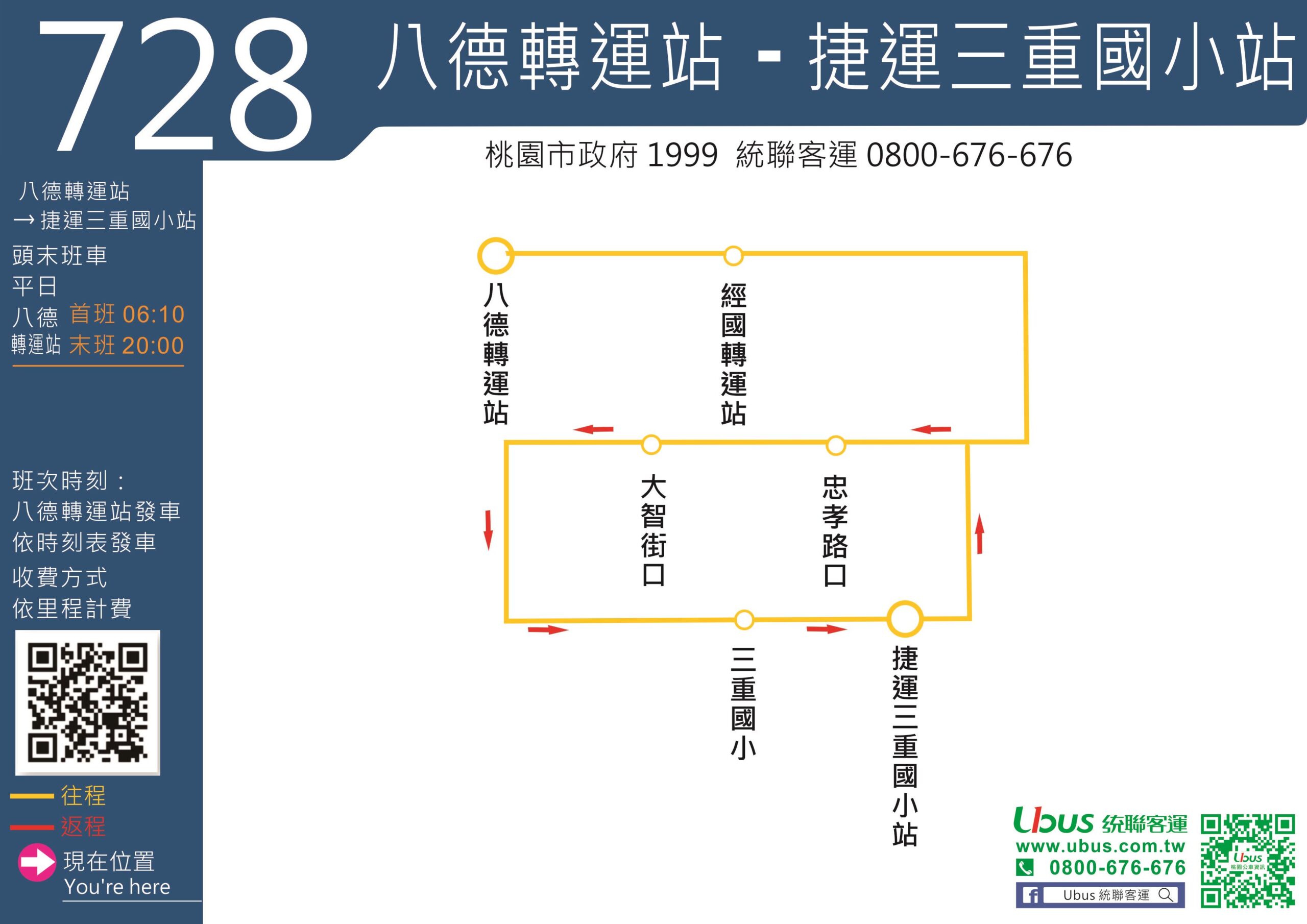 「【728】八德轉運站-捷運三重國小站」由統聯客運負責營運,路線自八德轉運站出發,行經國道2號及國道1號,停靠經國轉運站後再沿國道1號至捷運三重國小站後返回,採循環線營運模式,全程里程約77.6公里。