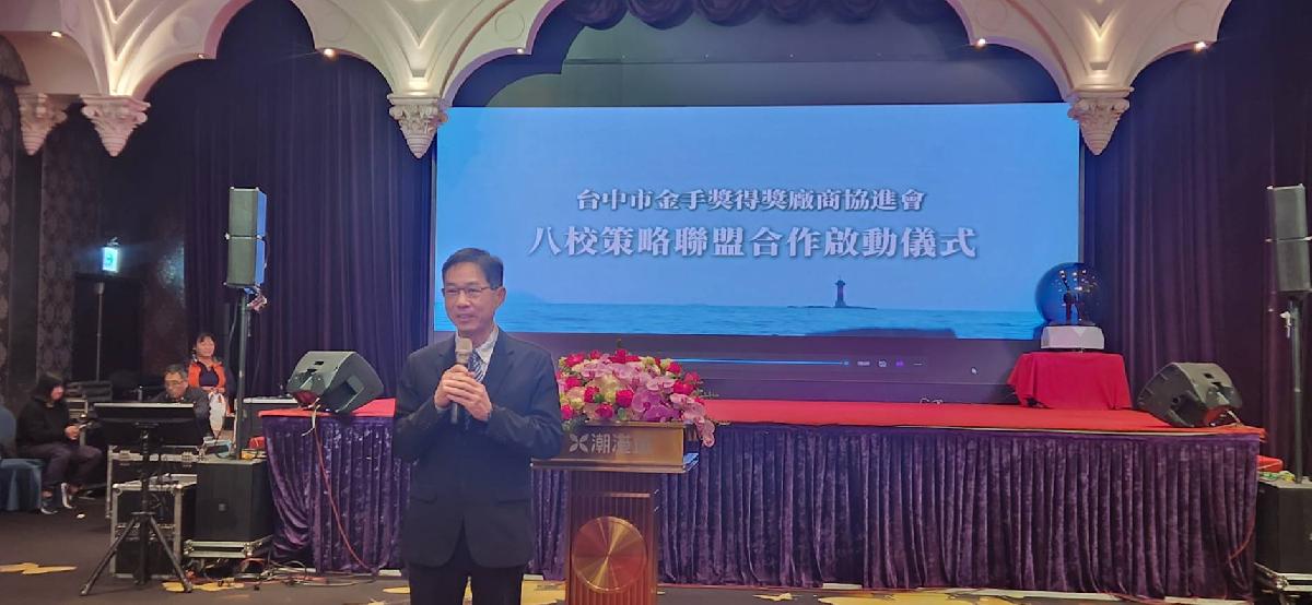 台中市金手獎得獎廠商協進會今(25)日攜手中部八所大學院校,包括中興大學、中山醫大、逢甲大學、東海大學、勤益科大、朝陽科大、修平科大及嶺東科大,共同簽署產學聯盟合作備忘錄,台中市政府經濟發展局長張峯源受邀出席見證,象徵產學雙方正式啟動實質合作機制,共同培育符合產業需求的專業人才。
