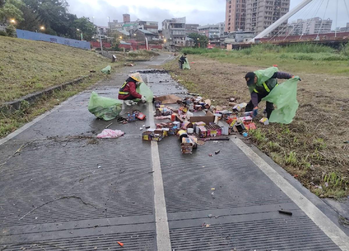 高灘處處長黃裕斌表示,河濱公園雖是熱門休憩點,但人潮帶來的垃圾問題卻日益嚴峻。統計今年農曆春節數據,短短初一至初六期間,全園區清運垃圾量高達177.36公噸,其中爆竹煙火廢棄物就佔了約82.86公噸。當遊客開心遊玩時,清潔人員卻得彎腰低頭,與成堆的垃圾奮戰;大量湧入的廢棄物不僅增加清運難度,更需額外調度壓縮車協助處理。此外,違規燃放爆竹產生的煙屑若掉入草叢,極易引發火災,保全人員除了需頻繁勸離違規民眾,更需隨時待命協助滅火及通報消防單位,疲於奔命。