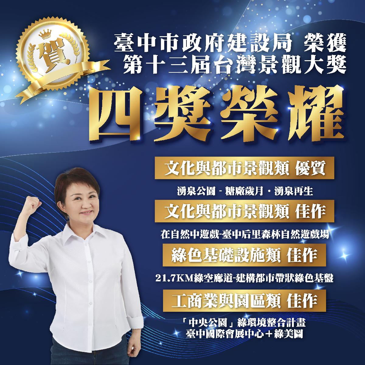 台中市長盧秀燕重視城市綠地發展與市民生活品質,持續推動「台中美樂地計畫」,以人本思維打造宜居城市。日前,中華民國景觀學會公布「2025第十三屆台灣景觀大獎」得獎名單,台中市政府建設局於文化與都市景觀、綠色基礎設施、工商業與園區三大類別一舉勇奪四項大獎,成果亮眼,展現台中在景觀美學與永續建設上的深厚實力。