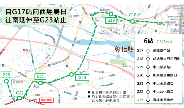 台中市政府捷運工程局長蘇瑞文表示,綠線延伸線全長約10.041公里,採全線高架設計,規劃設置8座車站。北段「大坑延伸段」自舊社站(G03)出發,跨越旱溪後延伸至大坑地區,全長約2.466公里,將新設2座高架車站;南段「彰化延伸段」自高鐵台中站(G17)起,沿烏日高鐵特定區往彰化市延伸,銜接彰化鐵路高架化後新設金馬站,全長約7.575公里,規劃6座高架車站。