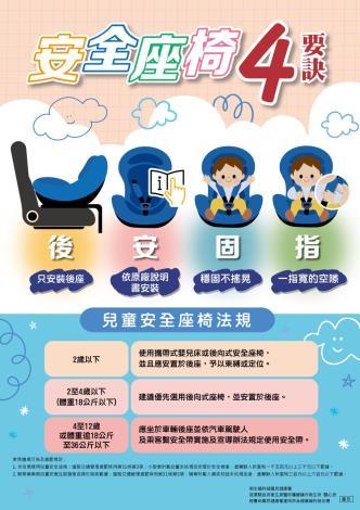 苗栗縣政府衛生局表示,家長在規劃假期行程時,務必將兒童乘車安全列為首要考量,依規定使用合格且適齡的兒童安全汽座,才能有效降低交通事故發生時的傷害風險。