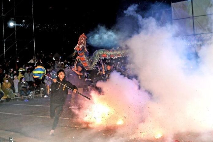 苗栗火旁龍系列活動28日晚間在後龍溪河濱公園進行壓軸「火旁龍之夜」,現場參與龍隊依序進場,接受鞭炮瘋狂轟炸,煙硝火光瀰漫整個河濱公園,持續一整晚。