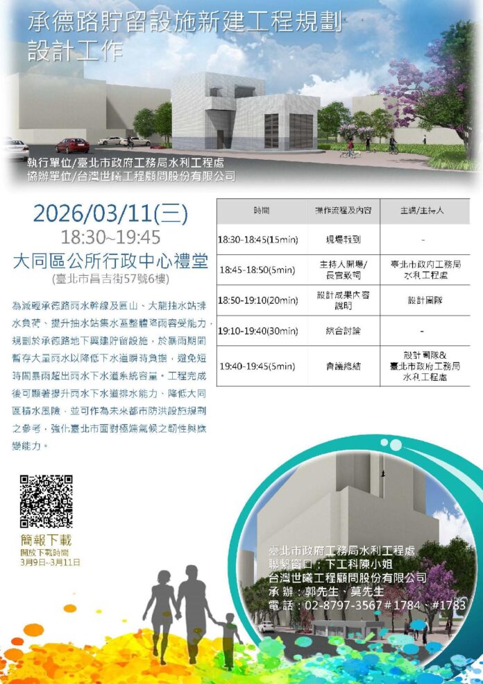 為改善承德路、錦西街、赤峰街及民生西路一帶長期於強降雨期間易發生積水情形,臺北市政府推動「承德路貯留設施新建工程」,這是北市第二座地下貯留管工程,地方說明會將於115年3月11日(星期三)晚間6時30分舉辦,北市水利處表示,誠摯邀請關心本案的市民朋友踴躍參與。