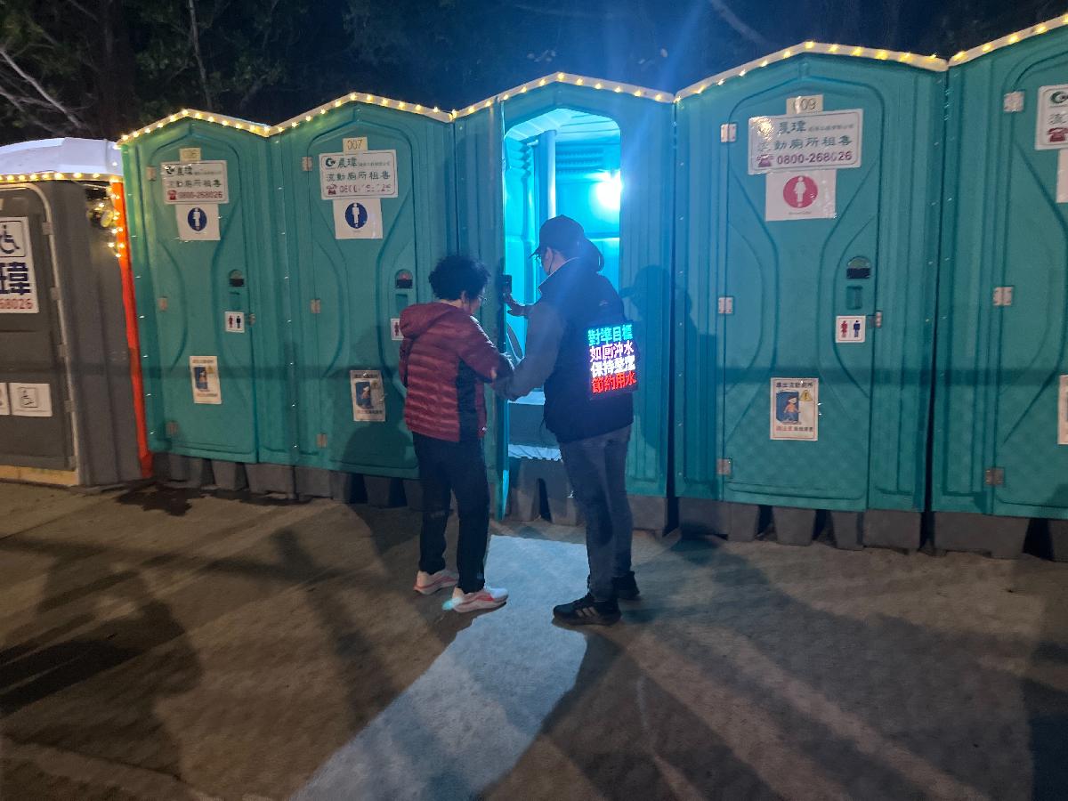 「多一份關懷、少一件事故。」環保局長吳盛忠表示,此次燈會環保局各處流廁點位均安排駐點專責人員隨時督導流廁清潔人員進行廁間清理工作,保持廁間整潔,也加強流廁照明及LED指引牌,同時積極引導長輩、行動不便者或孩童使用流廁設施,確保民眾如廁安全及品質,成功翻轉民眾對於大型活動租賃流動廁所既有髒亂、惡臭的負面刻板印象,感謝第一線人員辛勞付出,共同讓賞燈民眾感受到友善、乾淨、舒適又安心的優質如廁體驗。