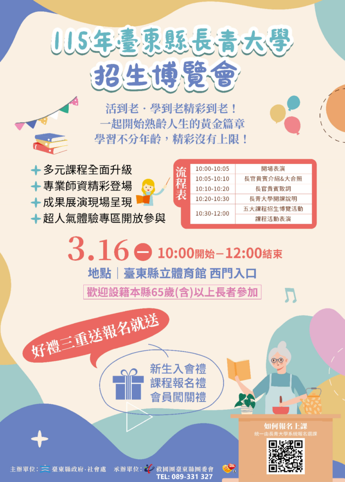 為鼓勵年滿65歲以上熟齡族群持續學習、拓展人際互動並提升生活品質,臺東縣政府將於3月16日上午10時,在臺東縣立體育館舉辦「臺東縣長青大學招生博覽會」,參加對象為設籍臺東縣且年滿65歲以上長者。縣府表示,博覽會以「全面升級・精彩加倍」為主軸,透過課程展示、體驗活動及現場諮詢服務,協助長者深入了解升級後的長青大學2.0學習資源,並推出新生入會禮、課程報名禮及會員闖關禮三重好禮,鼓勵長者走出家門參與學習,培養興趣專長,開啟精彩充實的樂齡生活。