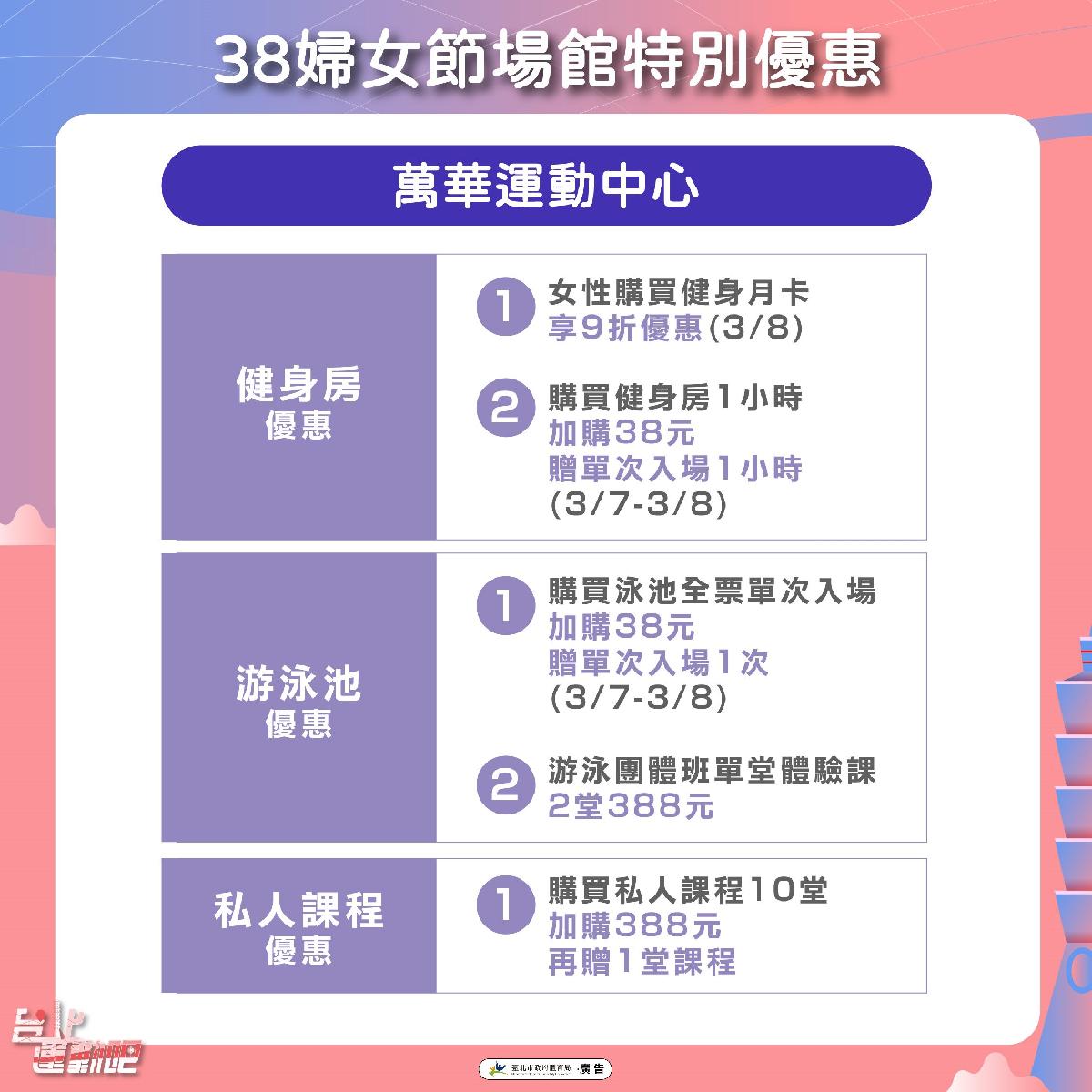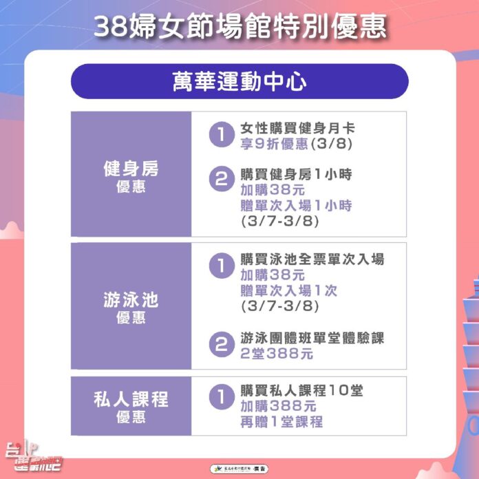 臺北市政府體育局為歡慶一年一度的國際婦女節,宣布於3月8日(日)推出專屬運動優惠,歡迎姐妹們至臺北市各運動中心、永春活力館、三民公園游泳池、榮星花園游泳池及臺北市網球中心健身房,享單次使用健身房或游泳池僅38元的優惠價,各中心也分別祭出女性專屬課程優惠。體育局表示,不論是平時肩負課業的學生、忙於工作的職場女性,或是照顧家庭的婦女,時常辛勞而疏於健康,希望在婦女節這一天,換體育局照顧妳,透過運動釋放壓力,重拾健康與自信。