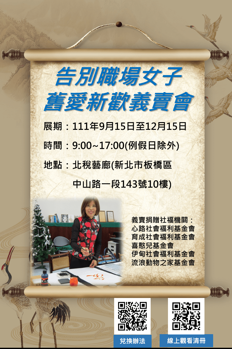 新北市政府稅捐稽徵處的北稅藝廊即將展出 「告別職場女子的舊愛新歡義賣會」,藉由義賣個展幫助弱勢團體並推廣以載具索取雲端發票,展期自111年9月15日至12月15日,上午9時至下午5時 (例假日除外),歡迎民眾踴躍參與。