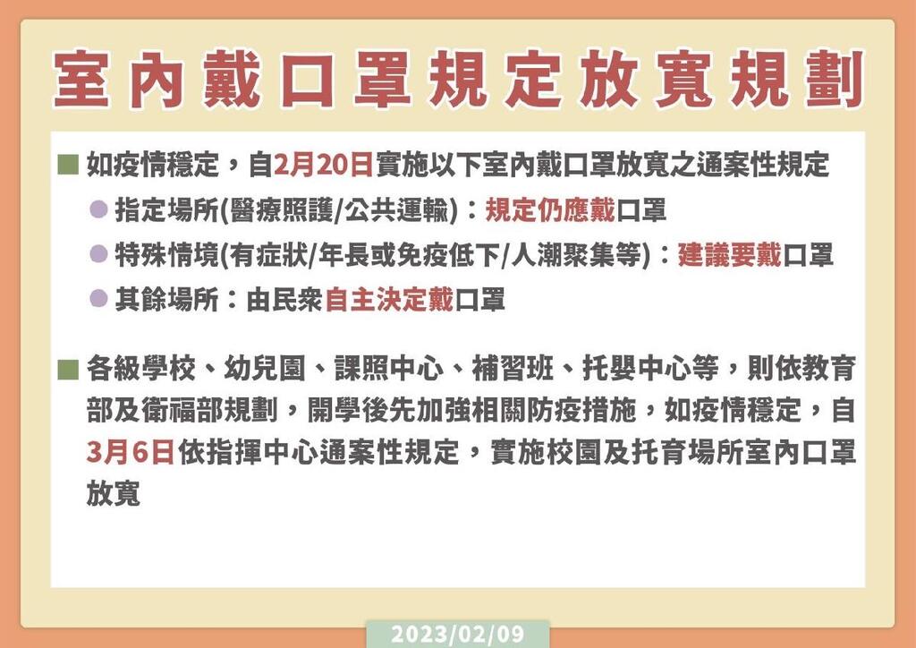 中央流行疫情指揮中心昨(9)日表示,經考量國內疫情逐漸平穩,醫療量能充足,且已進行跨部會溝通研議,經綜合評估後,如疫情持續穩定可控,自2月20日實施以下室內戴口罩放寬之通案性規定: