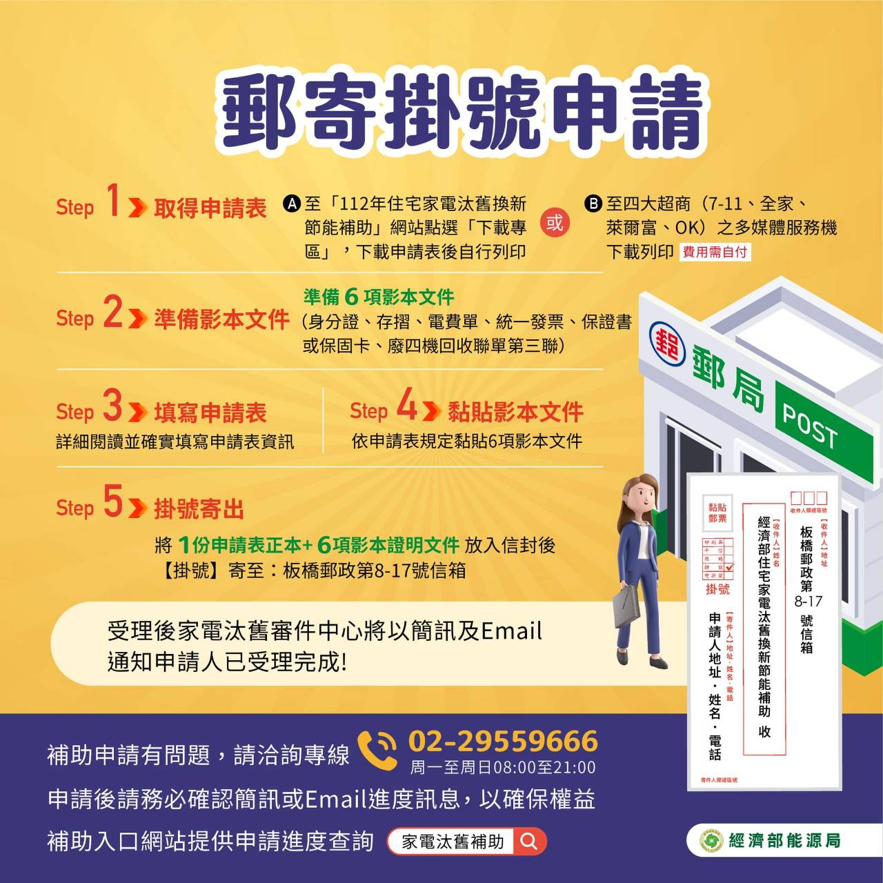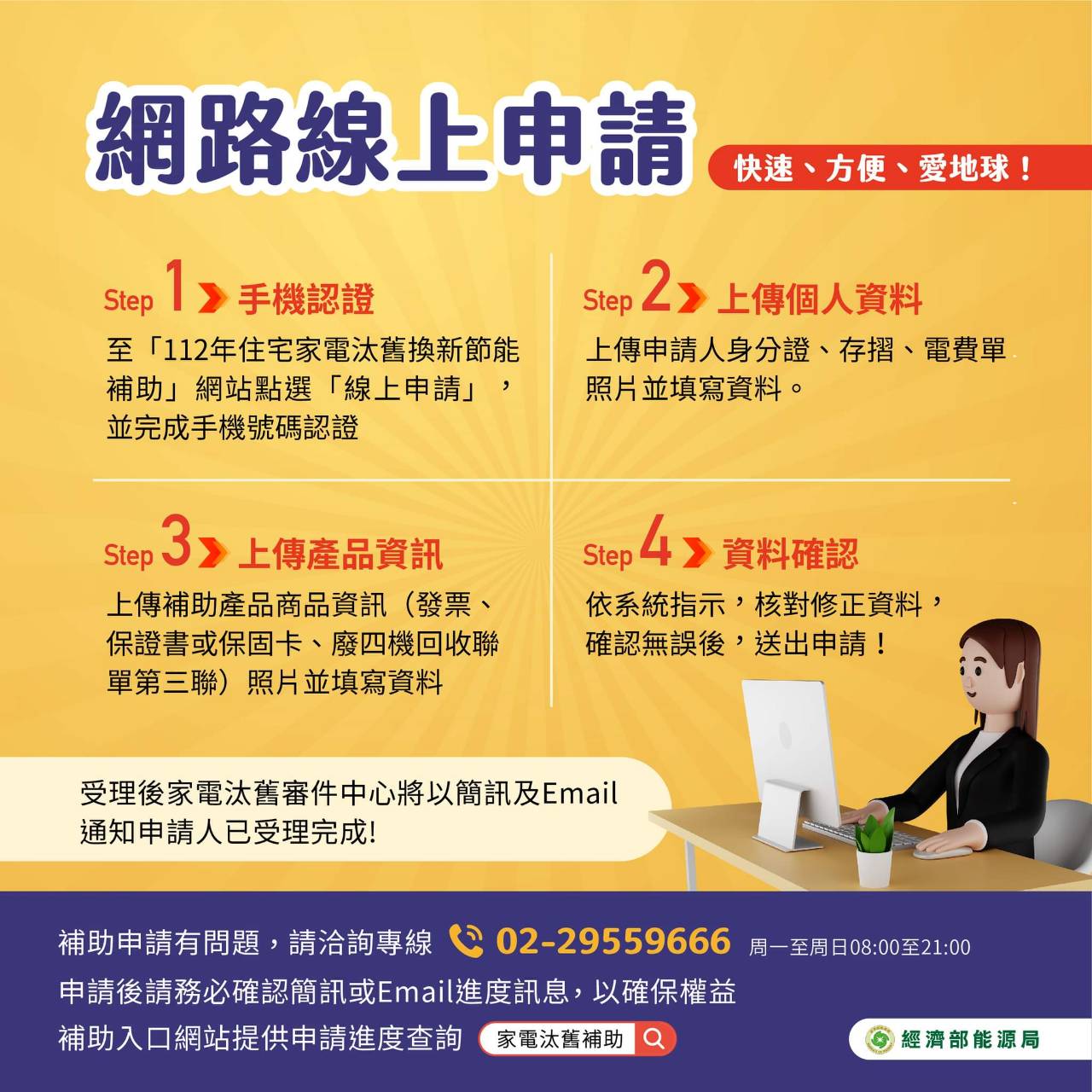經發局表示,為方便民眾查詢,除搜尋經濟部能源局住宅家電汰舊換新節能補助專屬網站(https://家電汰舊補助.tw)外,經發局官網也放上超連結,市民朋友可直接線上申請或下載表單填妥後寄送。補助期間能源局亦設置諮詢專線電話02-29559666,民眾可撥打洽詢申辦方式、查詢案件進度,或轉接專人一對一諮詢。