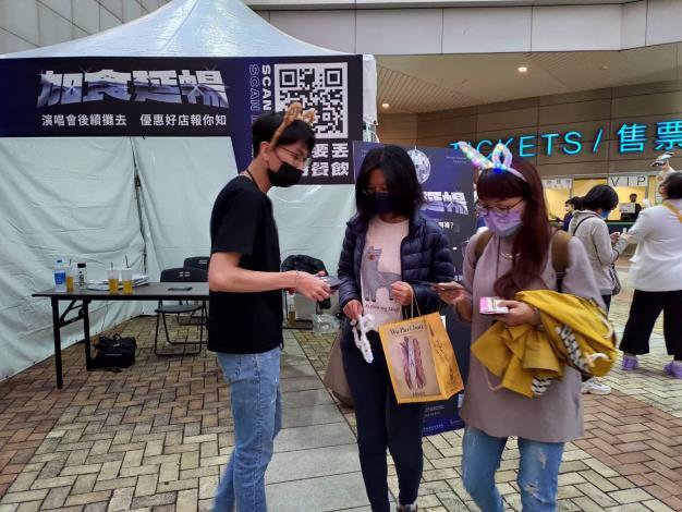 此外為宣傳「加食延暢」活動,經發局昨傍晚也動員在演唱會場外設攤,主動向準備進場歌迷說明活動方案,也發放酷卡提供QR Code讓歌迷掃碼查詢官網所提供各項優惠資訊,再次提醒歌迷朋友「票根不要丟」,保留票根可享高雄吃喝玩樂優惠。