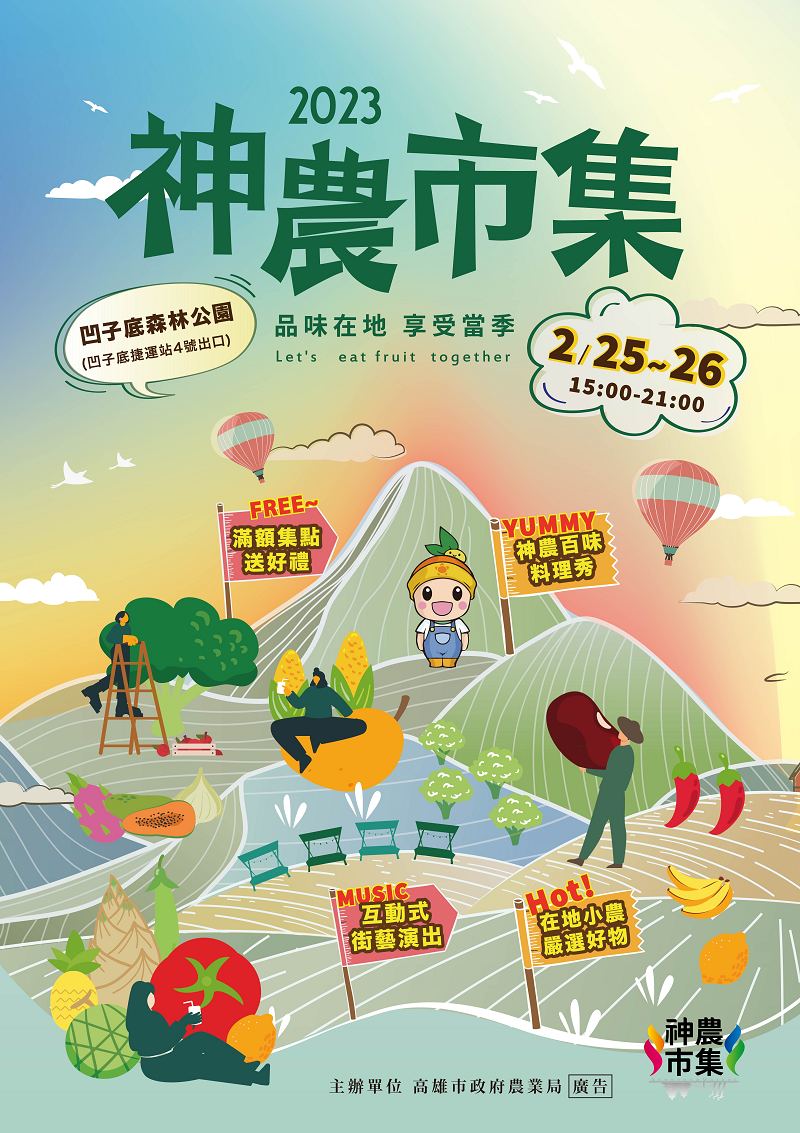 由高雄市政府農業局主辦的「神農市集」,兔年開春首發場將在本週末(2月25日及2月26日)於凹子底森林公園熱鬧展開,除了有南台灣優質小農展售當令農產外,還將舉辦「111年農糧產品產銷履歷輔導計畫」成果展,包括授證儀式、產銷履歷農產展售、食農教育闖關活動等,活動精采可期,歡迎踴躍參與。
