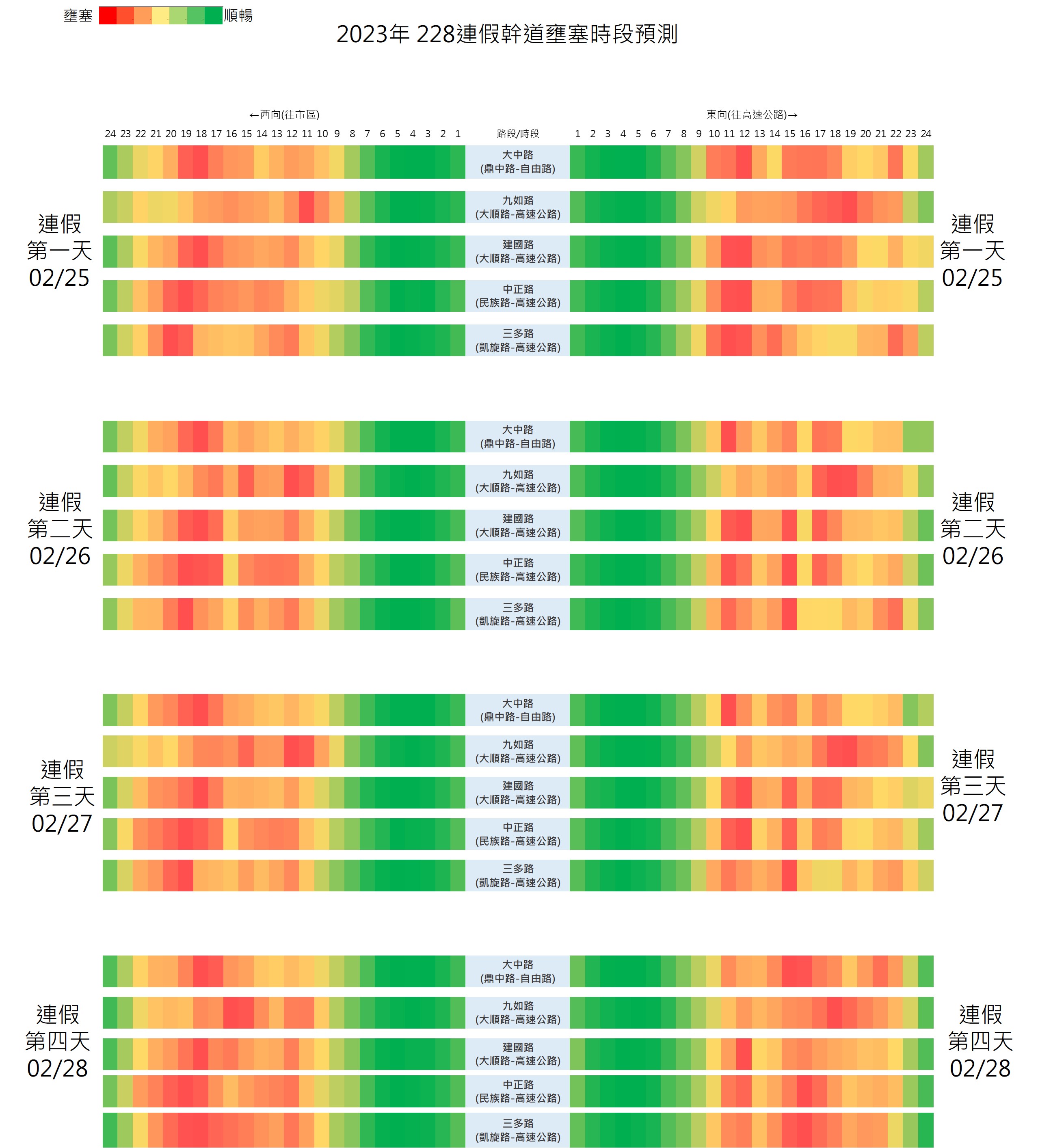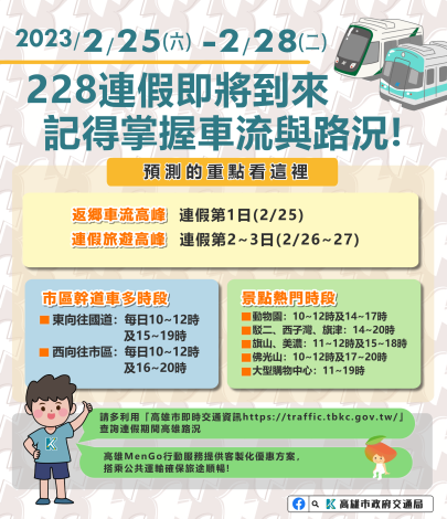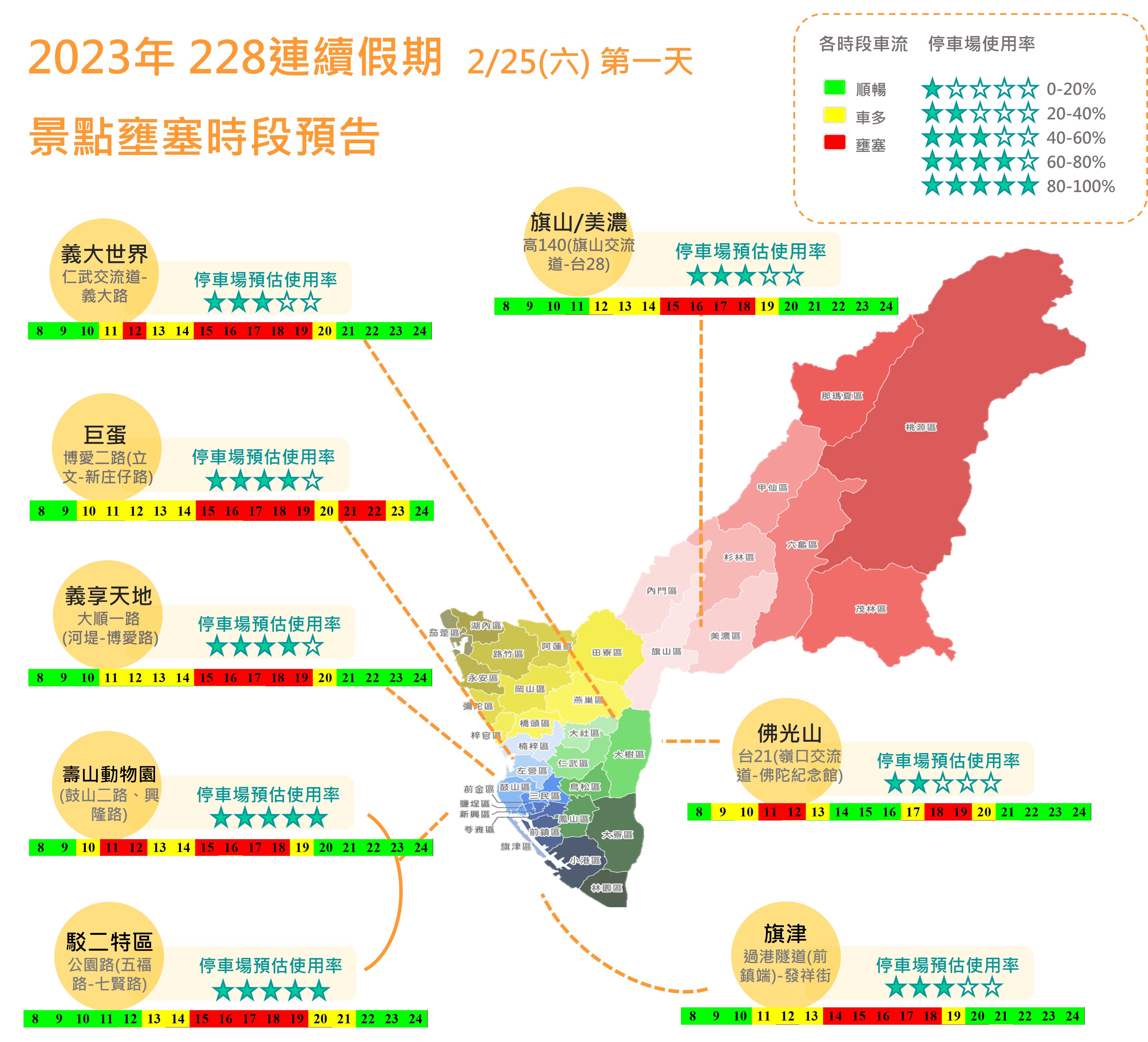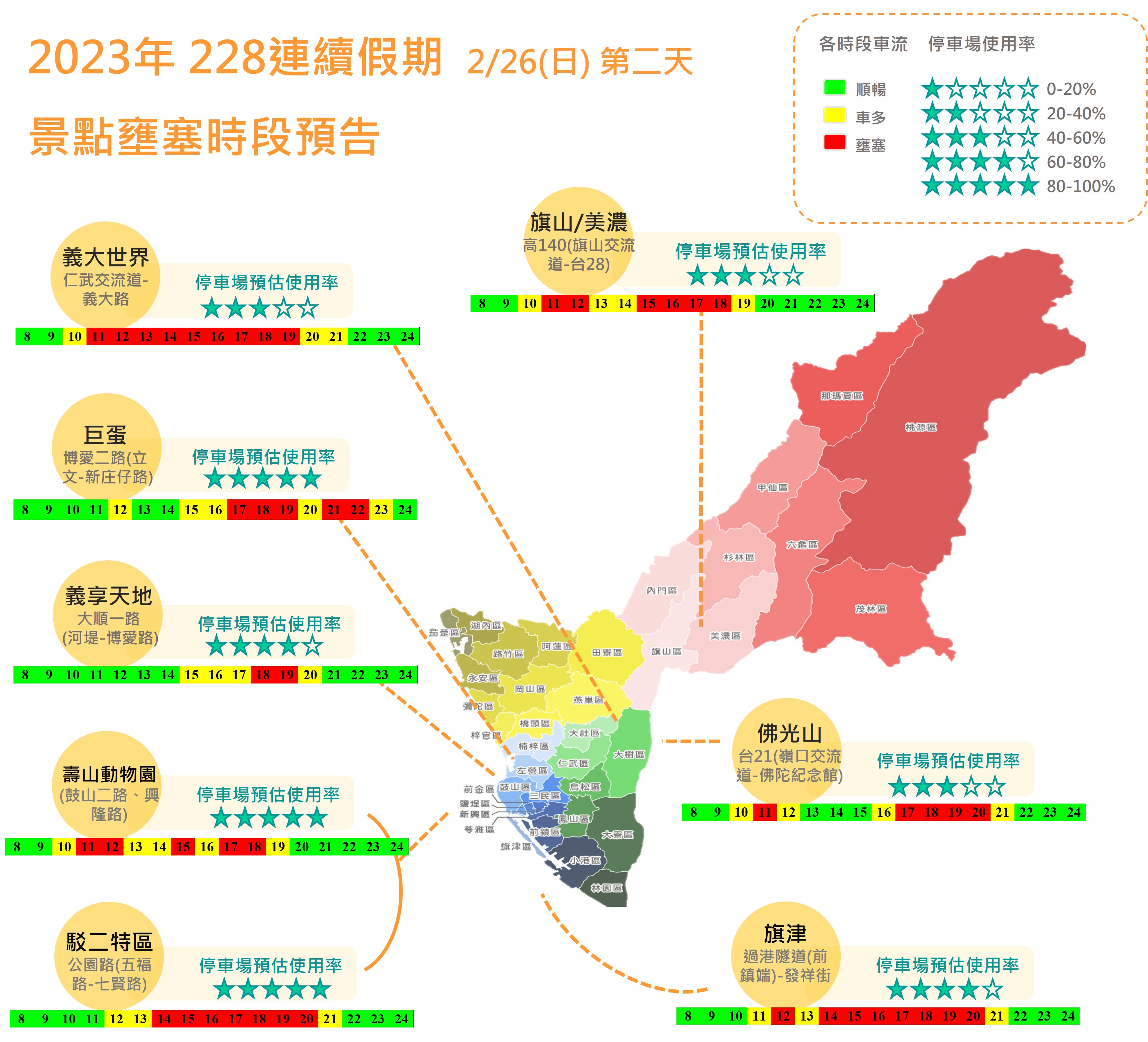 【高雄訊】交通局依據過往數據整理今(112)年228和平紀念日連續假期(2月25日至2月28日)車流預測供市民朋友參考。連假第一日(2月25日)將出現返鄉車潮,市區幹道流量較高;而旅遊高峰則為連假第二、第三日(2月26日、27日),熱門景點包含駁二、旗津、壽山動物園等周邊流量約較一般假日增加10%。