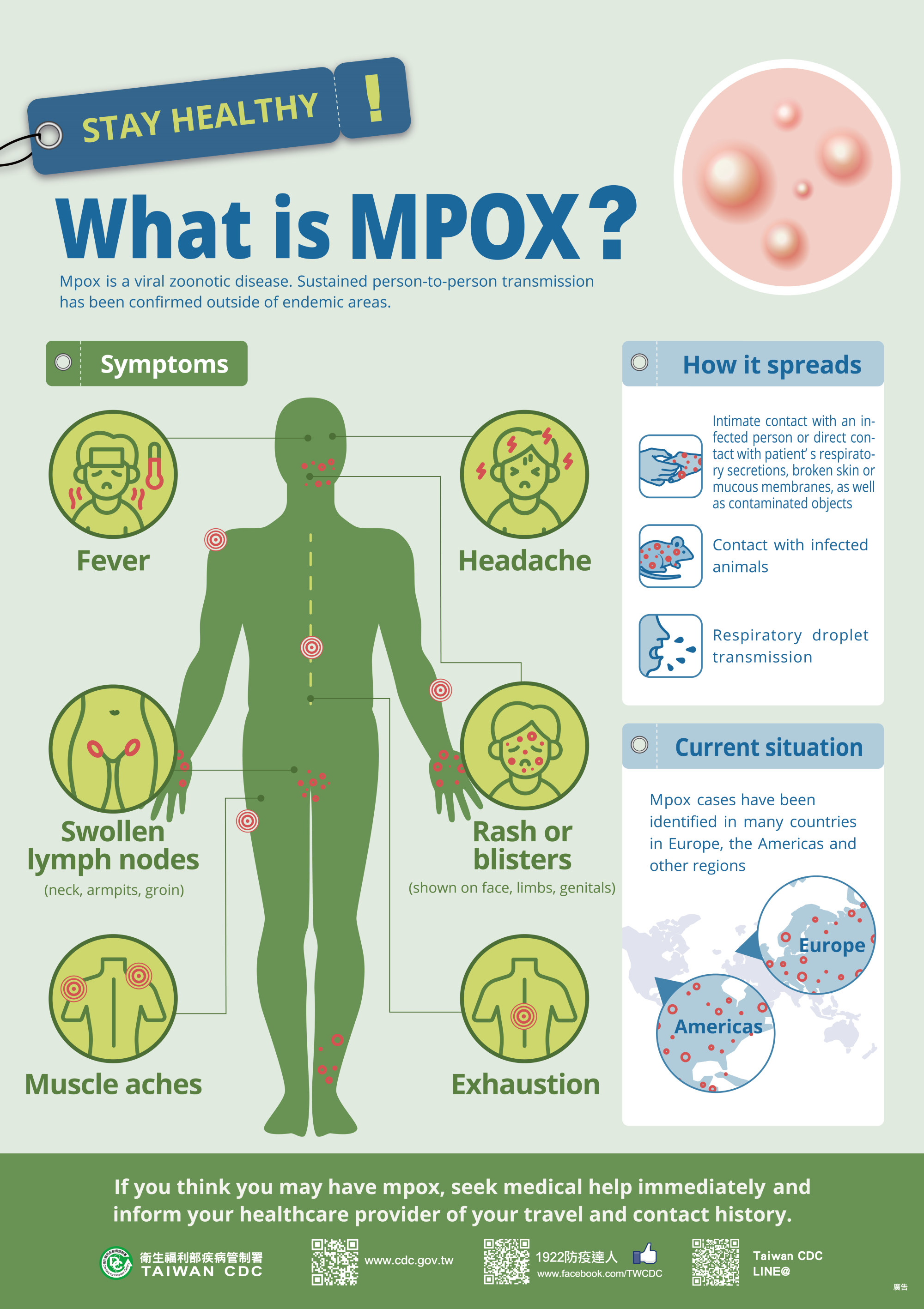 衛生局提醒市民朋友,如曾至流行地區旅遊或國內高風險場域,應落實自我防護,避免出入可能與不特定人士密切接觸之社交活動,若有出現疑似症狀,如出現皮膚病灶,例如:皮疹、水泡、斑疹、斑丘疹、水泡、膿疱等,以及發燒、畏寒/寒顫、頭痛、肌肉痛、背痛、關節痛、淋巴腺腫大(如耳周、腋窩、頸部或腹股溝等處)等疑似症狀,請盡速就醫,主動告知醫師接觸史TOCC(旅遊史、職業史、接觸史、群聚史)。相關資訊可至疾管署全球資訊網(https://www.cdc.gov.tw )或撥打國內免付費防疫專線1922(或0800-001922)洽詢。