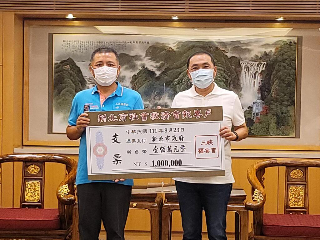 為照顧弱勢家庭,今(23)日三峽福安宮主委黃宗祥代表廟方捐贈新臺幣100萬元給新北市社會救濟會報專戶,由市長侯友宜代表接受,並致贈感謝牌,感謝廟方捐款行善攜手市府助弱勢。