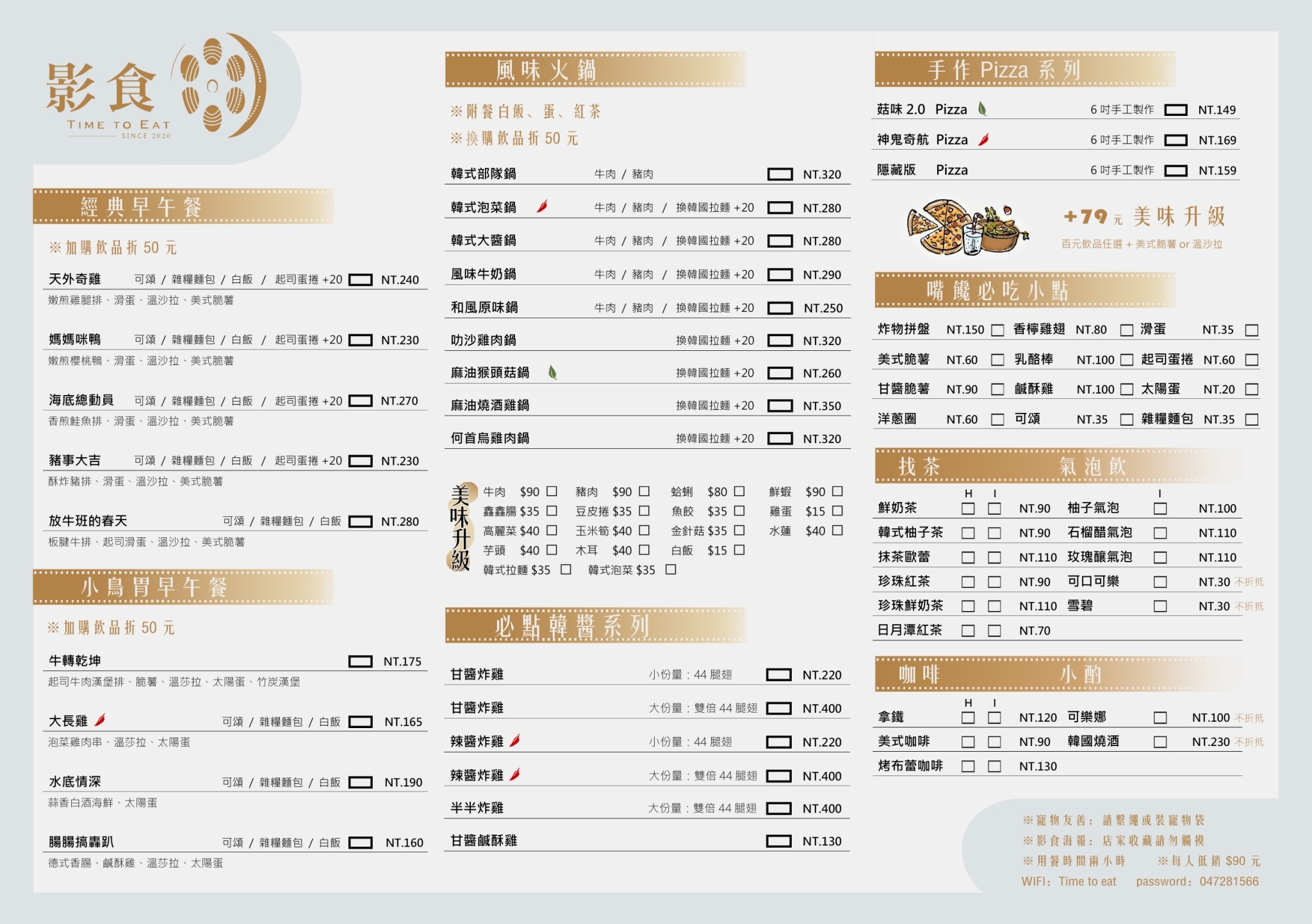 【影食 Time to Eat】販售各式的早午餐、蛋奶素餐點、韓國特色料理,給您最豐富的餐點,其中店內人氣最高的餐點是『韓式部隊鍋』,採用韓國進口的午餐肉還有韓國拉麵製成,湯頭則是用韓國大醬搭配韓式泡菜,最後在鋪上一片起司,一口喝下非常濃郁,肉片的份量也給的很足!