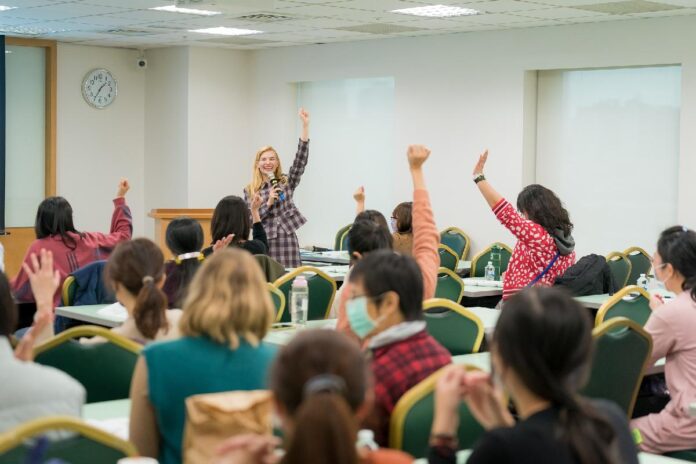 此外,空中英語教室團隊也在北、中部辦理教師研習,以「Give Me 10!每天說10分鐘英語」為課程主軸,由空中英語教室外籍教師教學團隊向國中小教師展示如何以有趣且有效的方式在遊戲中教英語,讓老師們在現場實作,練習以遊戲提高學生的投入興趣和課堂參與度,並鼓勵教師持續帶領學生每周或每天定期進行開口說英語10分鐘活動,讓開口說英語成為習慣。參與的臺北市銘傳國小英語老師蕭夙娟表示,很高興可以學習到許多能幫助小孩英語學習的技巧。