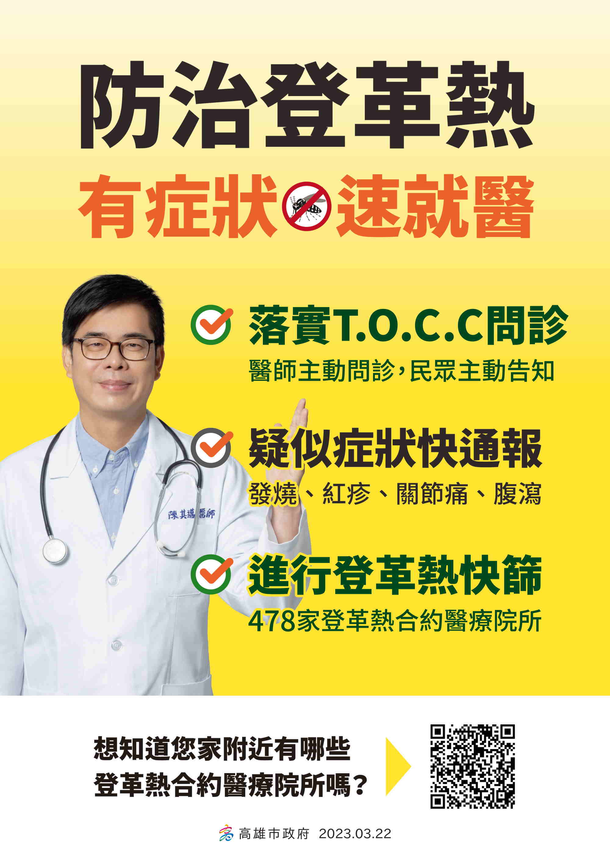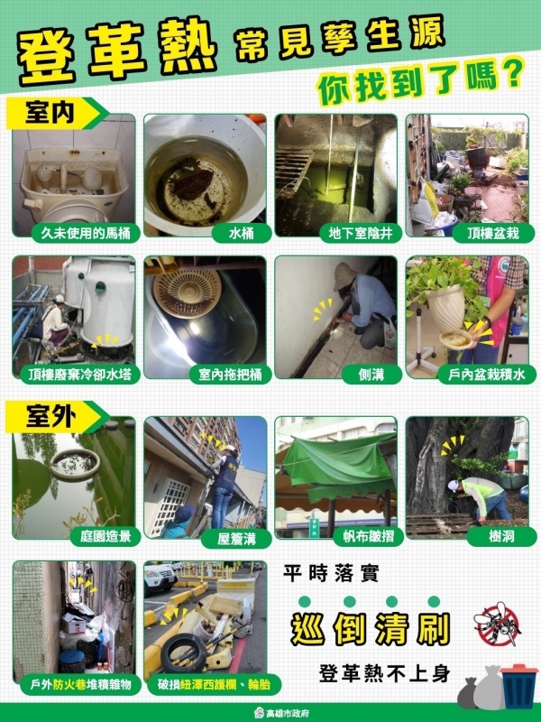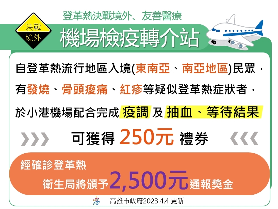 陳其邁市長提醒,東南亞國家登革熱疫情嚴峻,呼籲自東南亞等登革熱流行地區入境小港機場且出現不適症狀者,通關時務必主動告知機場檢疫人員進行採檢,衛生局將頒贈250元禮券。返國後14天內如出現發燒、頭痛、骨頭肌肉痠痛、腹瀉、皮膚出紅疹,請盡快就醫並主動告知醫師相關旅遊史,尤其請醫師提高警覺落實TOCC(旅遊史、職業史、接觸史、群聚史)並通報落實抽血採檢,高雄市共有478家「登革熱整合醫療合約院所」免費提供快篩試劑( https://reurl.cc/9Vx55Y),可於抽血採檢30分鐘內完成初步檢驗。此外,請市民朋友也要注意家中室內外環境是否有儲(積)水容器如花器、桶缸盆甕等應妥善維護管理,針對特定公私場所、空屋空地使用人、管理人及所有權人,應妥善維護環境,每週定期落實「巡、倒、清、刷」,共同降低社區病媒蚊密度,阻斷病毒傳播鏈,共同維護自身及社區健康安全。