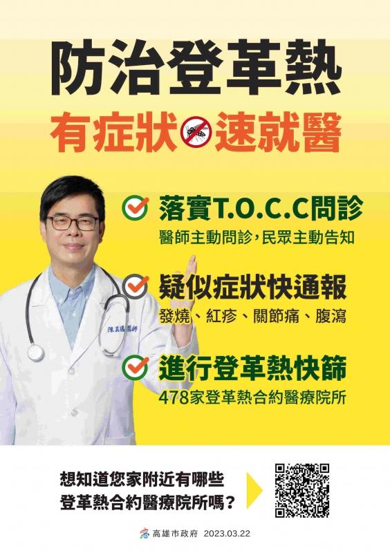 陳其邁市長提醒市民朋友,自東南亞或中南美等登革熱流行國家或地區入境者確實留意自身症狀,若有症狀應儘速就醫快篩,也應注意是否有合併發燒、頭痛、後眼窩痛、肌肉關節痛、出疹等登革熱典型症狀,並主動告知旅遊史,早期通報早期治療;入境後5日內或出現症狀2日內經自主通報而確診者,並可獲得新臺幣2500元獎勵金。尤其請醫師提高警覺落實TOCC(旅遊史、職業史、接觸史、群聚史)並通報抽血採檢,高雄市共有478家「登革熱整合醫療合約院所」免費提供快篩試劑,可於抽血採檢30分鐘內完成初步檢驗(網址: https://reurl.cc/9Vx55Y)。