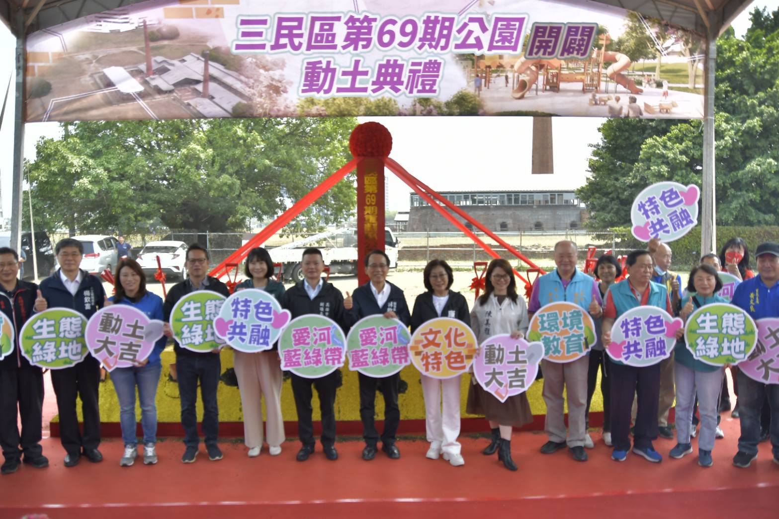 第69期重劃區公園開闢工程動土典禮,於今(12)日上午舉辦,由林欽榮副市長偕同市府工務團隊,與當地民意代表及里長共同參加動土儀式,預計於今年底完工,地方民眾扶老攜幼前來共同關心及見證市府對市政建設的用心及承諾。第69期重劃區位於三民區中都地區,沿同盟路側接臨愛河,區內劃設約3公頃的公園用地,近同盟三路及中華橫路口,分別進行公6及公32的公園開闢及整建,結合周邊國定古蹟中都唐榮磚窯廠的文化底蘊以及中都濕地公園的豐富生態,將在地歷史脈絡與愛河藍綠帶作串聯,營造出共融特色公園,為中都地區增添媚力光彩。