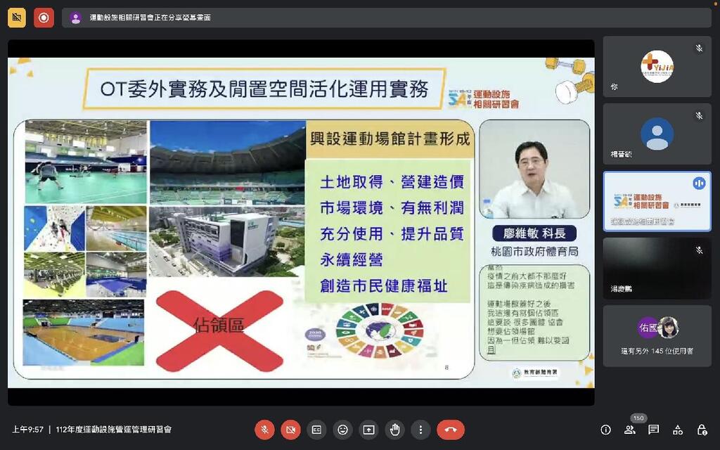 教育部體育署今(14)日以線上直播方式辦理「112年運動設施營運管理研習會」,邀請各縣市政府相關單位及全臺各地運動中心、體育場館營運從業人員,共計150餘位學員一同連線學習。