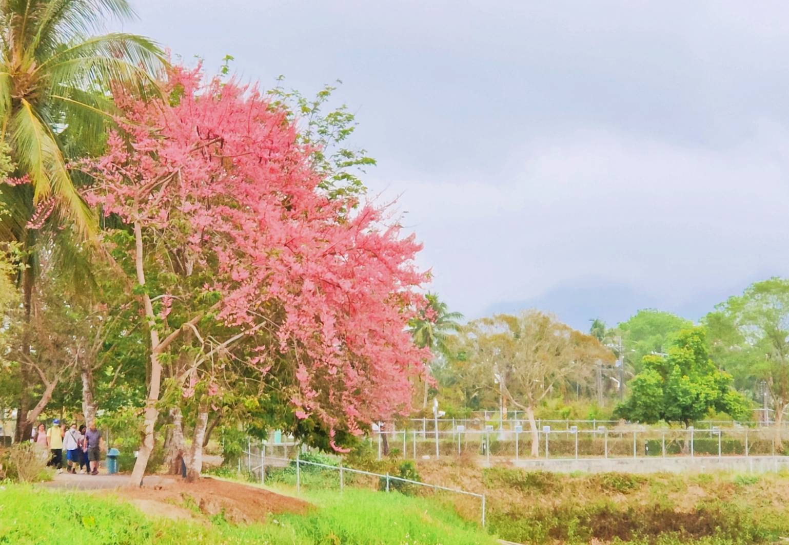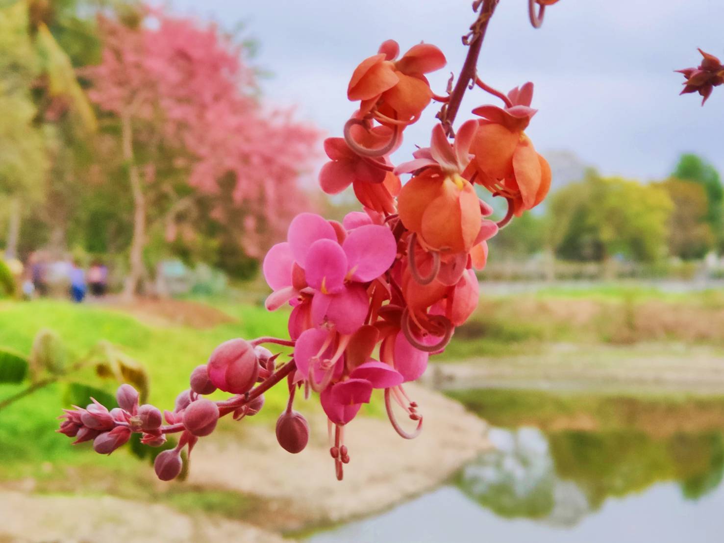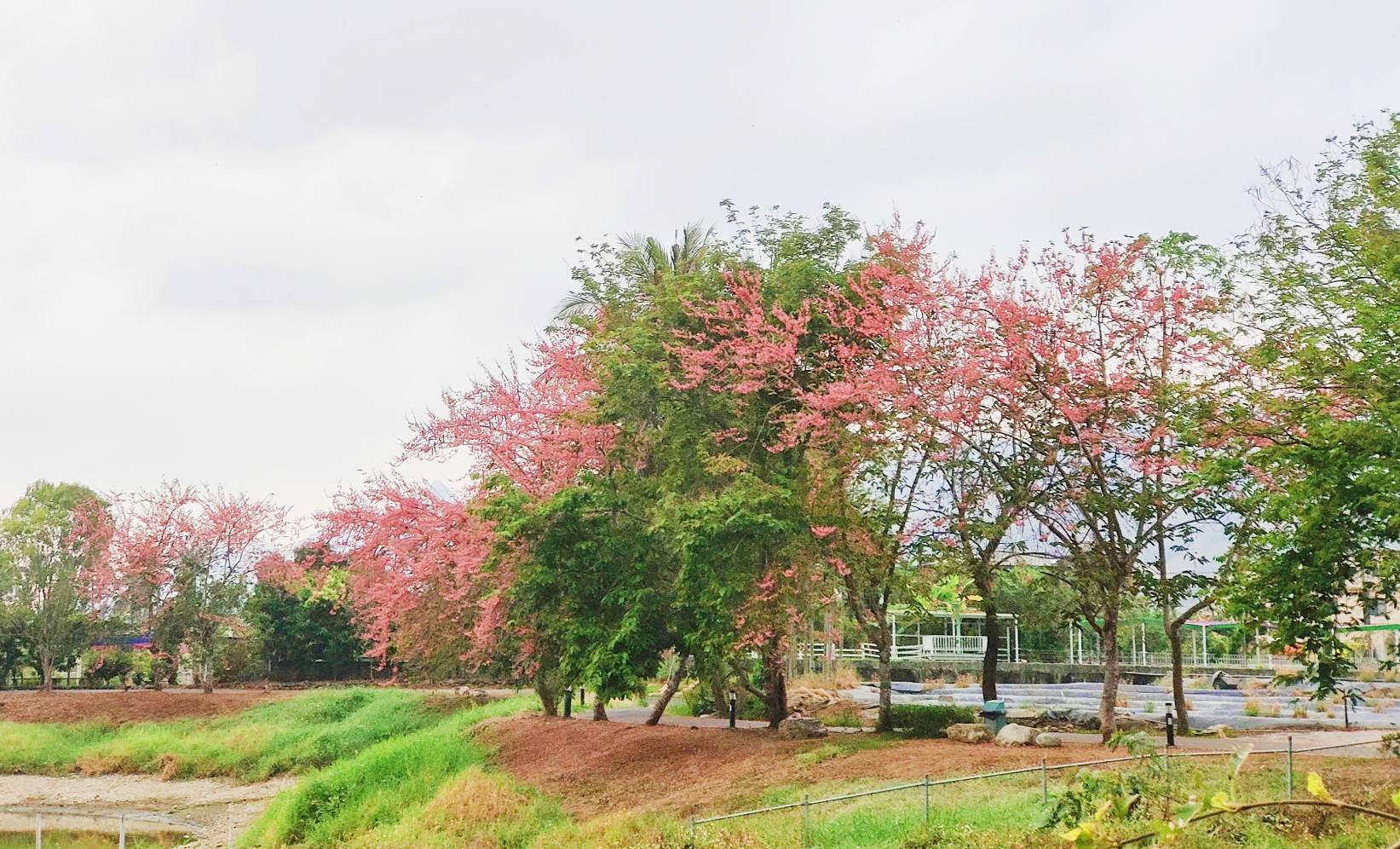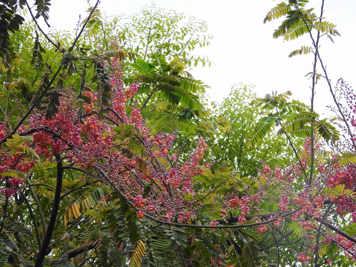 養工處表示,紅花鐵刀木(Cassia grandis L. f.)原產地熱帶美洲等地區,台灣於 1903 年分別由印尼及夏威夷引進,果莢粗壯又稱大果鐵刀木或紅花臘腸樹,蘇木科黃槐屬(決明屬),花期約暮春至夏季(約4至6月)之間,市民朋友目前可以在楠梓區德民路、草衙捷運站、寶業里滯洪池周邊與洲仔濕地,以及旗山美濃地區都可看見。它與初夏開花的阿勃勒是同家族,花開時串串總狀花序搖曳生姿,花瓣隨風飄落如雨滴,相較於阿勃勒「黃金雨」的稱呼,紅花鐵刀木則有「珊瑚雨」的詩意別名。季節限定的花開美好,邀請大家一起踏青尋芳蹤。