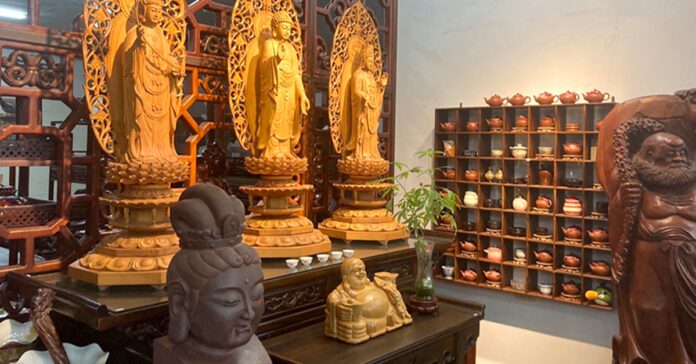 這裡供奉著莊嚴的西方三聖,擺放著《甄嬛傳》中貴妃們坐的羅漢床,還有象徵著團團圓圓的中式木製餐桌,餐桌上擺有一套青花瓷餐具,木頭穩重,瓷器輕巧,二者相得益彰,讓人忍不住想坐下來大快朵頤。大到木製衣櫃、木製床組,小到木製杯墊、印章,這裡充滿著各種規格的木製品,若沒找到心儀的,還可以量身打造木製定做物品。