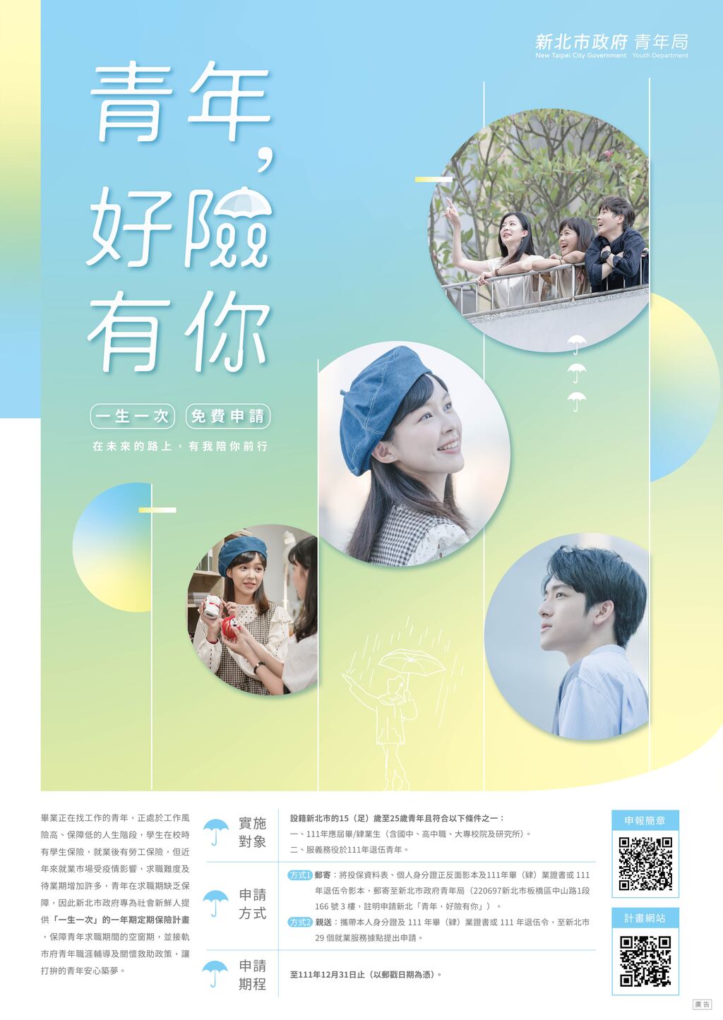 在111年10月31日前投保且完成核保者,還有機會抽SWITCH、AirPods、500元超商禮券等超過200個好禮,讓新北求職青年更有保障的去逐夢。詳細活動訊息請洽新北市政府青年局網站(www.youth.ntpc.gov.tw)或洽(02)2957-8510查詢。