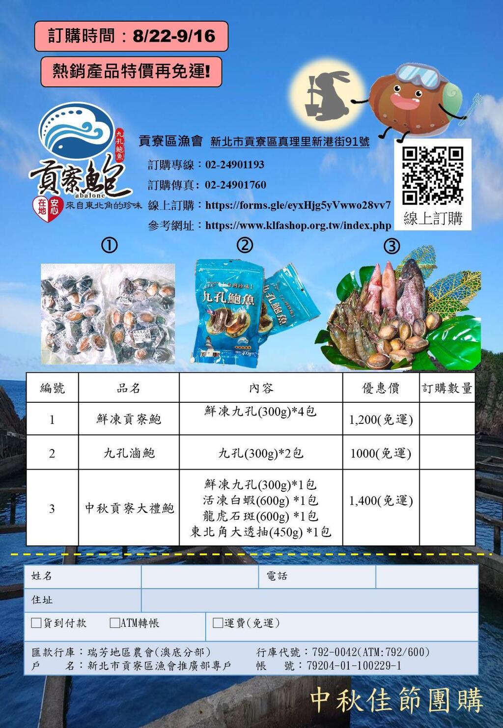中秋佳節即將到來,為了讓大家歡慶中秋時提前品嚐美味東北角最靚海鮮-新北貢寮鮑(九孔及黑盤鮑),新北市漁業處和貢寮區漁會共同輔導養殖業者嚴選貢寮鮑進行冷凍加工,配合即將到來的中秋節推出優惠團購活動,讓我們闔家團圓一邊賞月,一邊品嚐美味貢寮鮑。