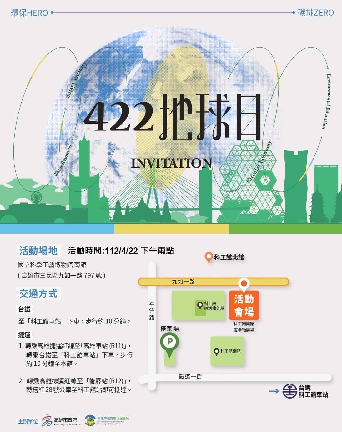 今年世界地球日活動以「投資地球」為主題,環保局訂於112年4月22日地球日當天於國立科學工藝博物館舉辦「422地球日-環保HERO 碳排ZERO」活動,邀請市民參與活動體驗綠生活模式。